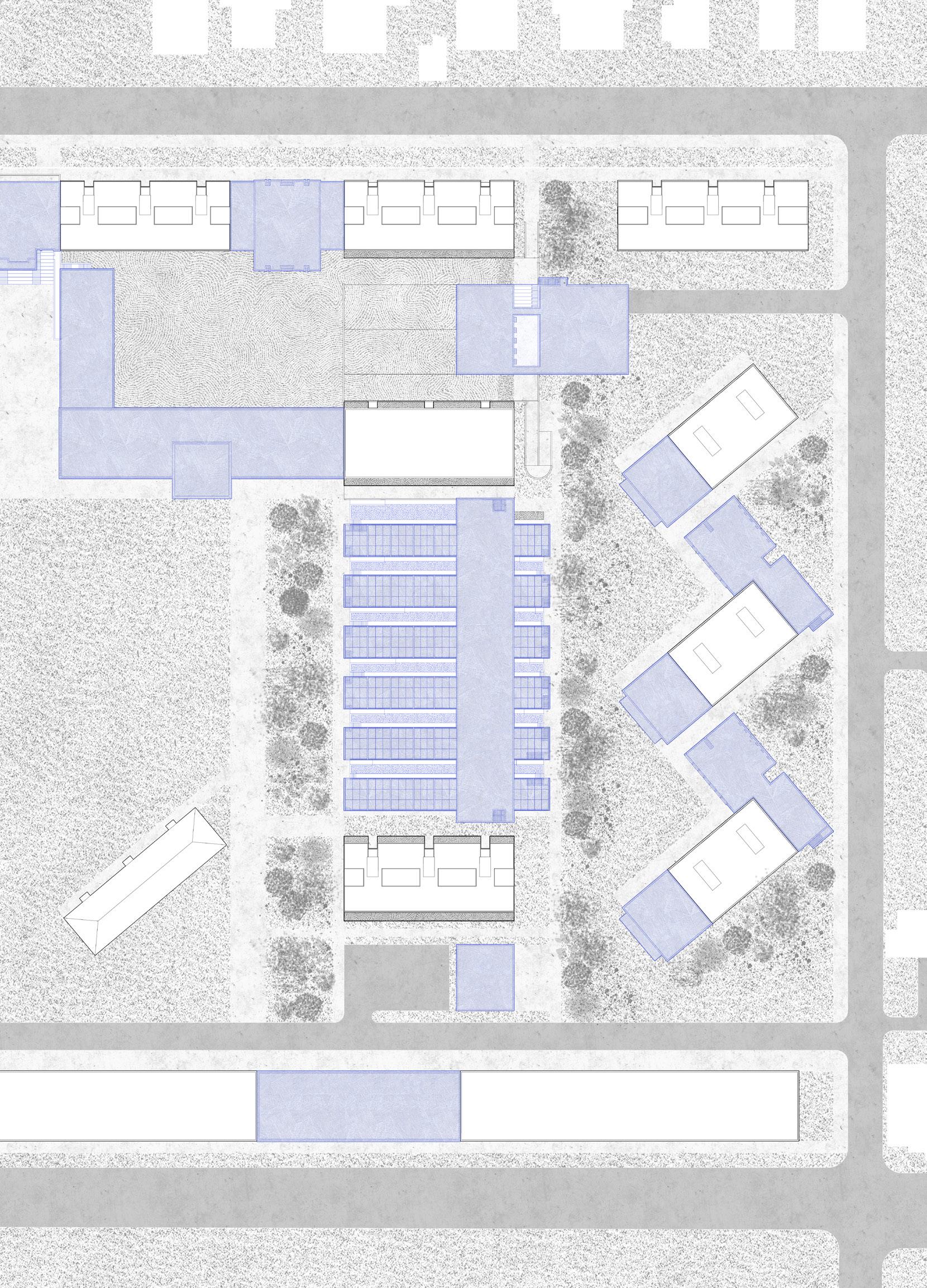 Urban farms and collective spaces connect the block, preserving historical layer through conserbation of two I-464 buildings.
