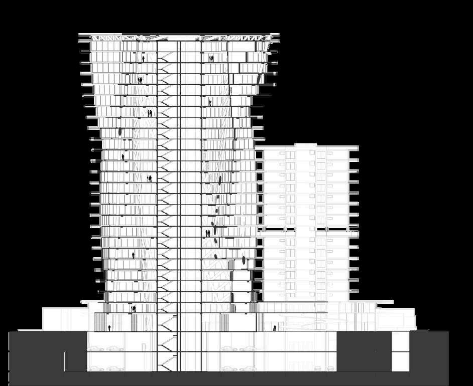 Para o complexo funcionar, setorizamos o prédio em 4 partes: Comércio, Lazer, Residencial e Corporativo. O comércio e o lazer precisam ter fácil acesso ao público, por isso, ficaram no térreo e no primeiro Pavimento. Além disso, são os andares que interligam as duas torres.