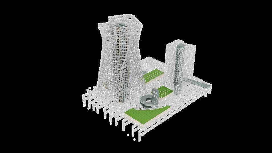 A planta tipo do corporativo é livre, podemos mudar as paredes de lugar e fazer novas aberturas que não afetarão a estrutura Temos um núcleo de circulação vertical onde segura toda a parte central estrutural A estrutura do prédio é por meio de treliças metálicas, elas seguem com os pisos e os pilares A partir dos nós delas temos a fixação com todos os andares com o núcleo central.