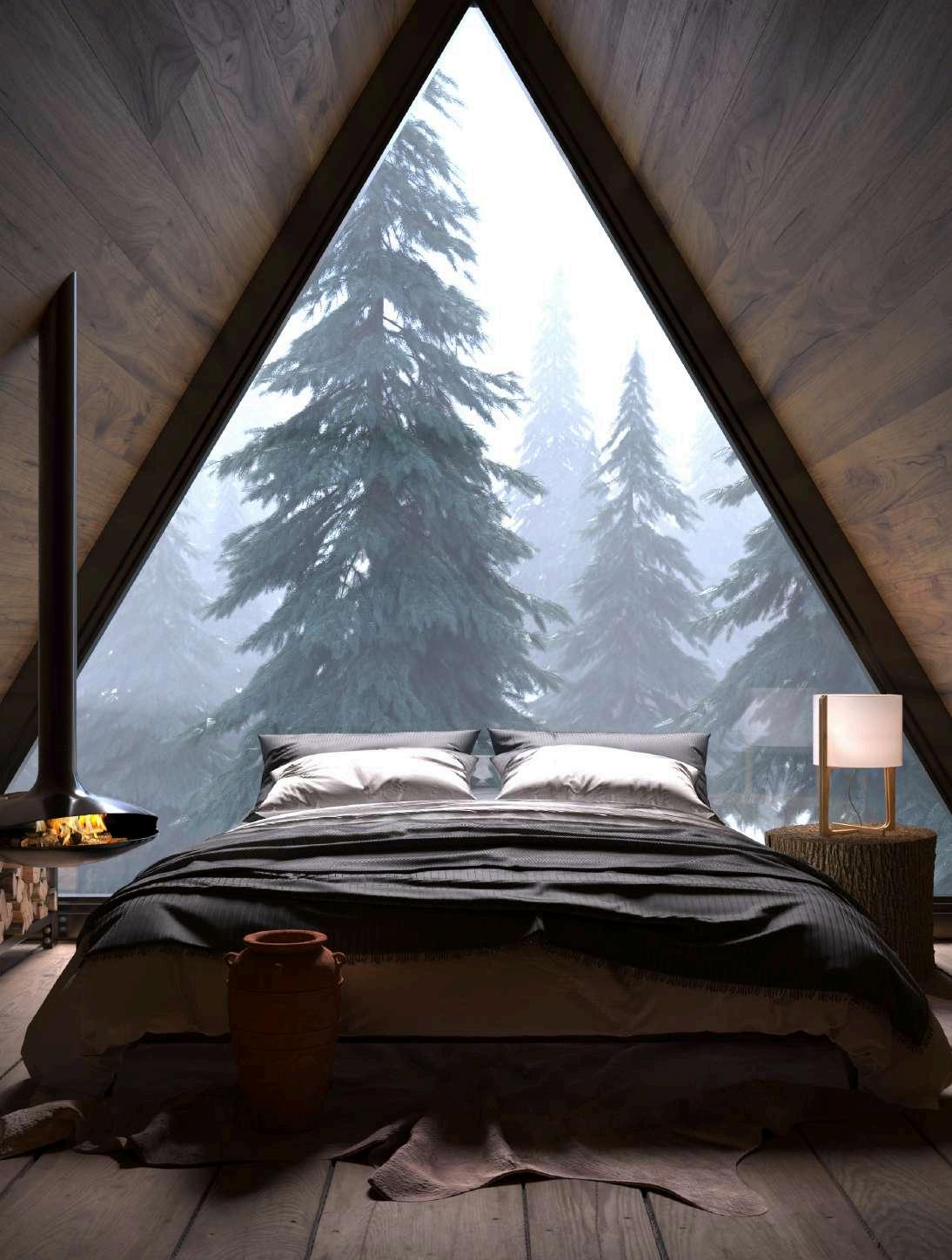 O quarto é onde tem a vista da floresta, uma vista tranquila e perfeita para uma lareira.