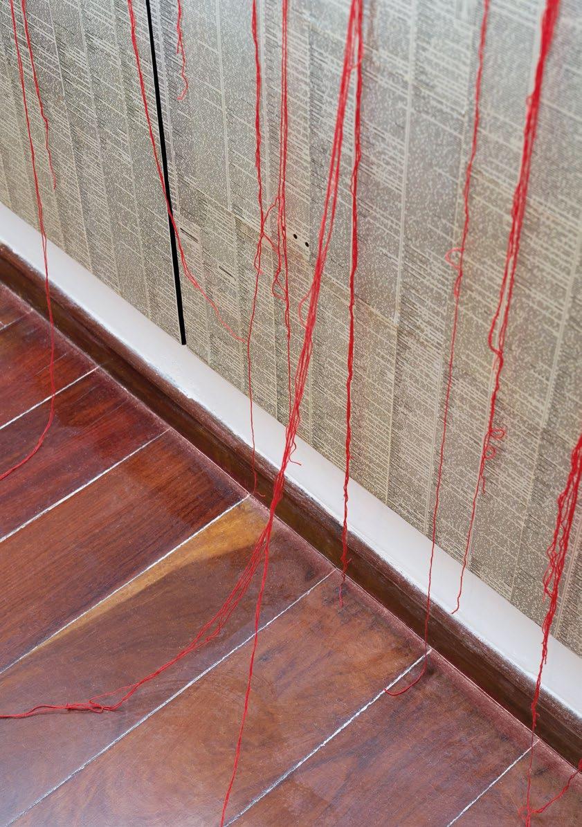 A artista observa que, embora tenha constatado a decomposição dos livros há mais de dez anos, um longo caminho se fez até poder amarrá-los, decompor as páginas e sustentá-las por alfinetes, expor sobre uma mesa, enquadrar em placas de acrílico e/ou sob foco de luz, bordar, desenhar sobre um relevo de páginas, reaproveitar as capas marcadas por fungos. Desgarrados e brilhantes, os objetos explicitados em sua decomposição e inoperância, tanto travam um combate com a imponência do que foi a presença paterna e sua biblioteca, como um trabalho de elaboração da dor causada pela perda materna. Assim, enquanto a literatura é processada como coisa, a linha torna-se um texto indecifrável que segue pontilhado, contornado, amarrado ou esvaído. Suspensos pelo fascínio entre o quase tudo que foi e o quase nada que resta, seus trabalhos acolhem o espectro que habita o âmago daquilo que