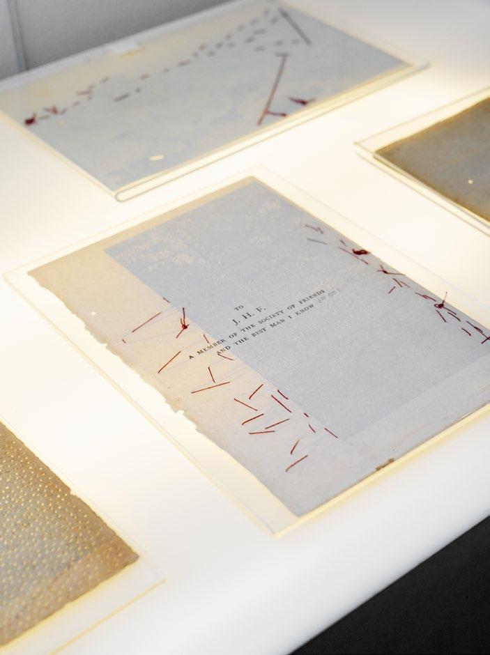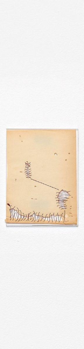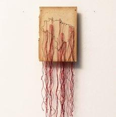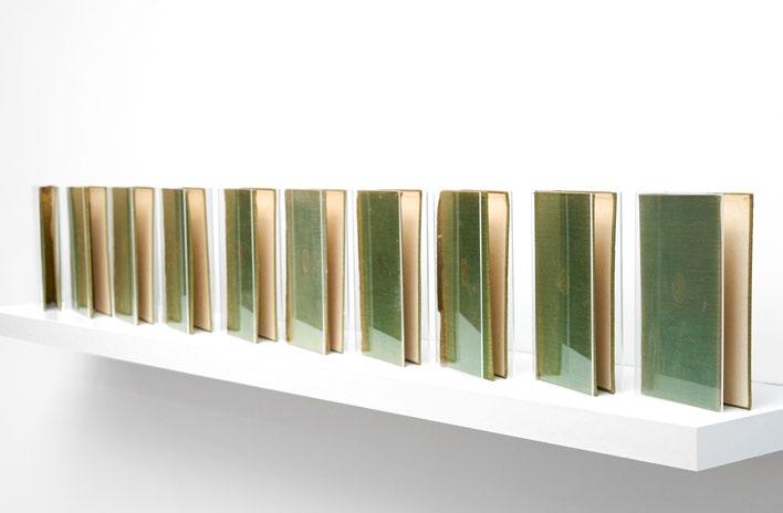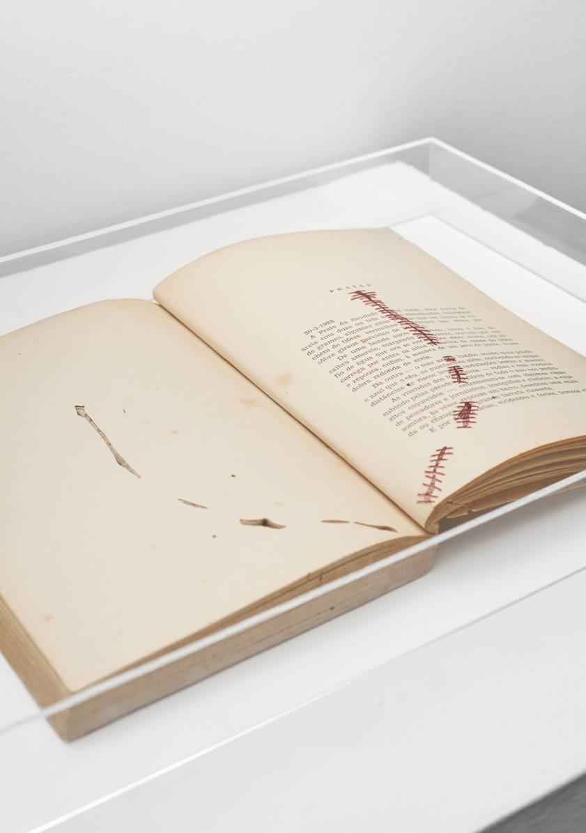 de cupins e traças sobre páginas de livros e sua transformação em outra coisa. Distantes daquilo que um dia foram, destituídos da função que um dia tiveram como meio de conhecimento ou mesmo objeto simbólico, os livros tornaram-se vestígios reconfigurados, cujas páginas foram enleadas, cerzidas ou reagrupadas; suas capas foram dadas a ver como estamparias ou bordados, além das suas estruturas carcomidas que foram mostradas como objetos tridimensionais e dos seus títulos que ganharam sentidos irônicos e instigantes. A propósito deste material, com o qual iniciou-se como leitora, a artista conta que, por mais de uma década, não soube o que fazer com os restos da biblioteca paterna, composta por autores como Herman Melville, Jack London, Jonathan Swift, William Shakespeare, dentre outros. Ruína de uma biblioteca, temor de um bibliófilo e de leitores ávidos, o trabalho dos cupins e traças tornou-se o foco da exposição de 2017. Na maioria dos casos, a ação dos insetos recebeu destaque, dispensando qualquer elaboração ou desdobramento em outras faturas, sendo que o trabalho da artista consistiu em evidenciar o seu protagonismo, atuando como uma espécie de interlocutora atenta. Além dos pontilhados e amarras, o trabalho do tempo e a decomposição das páginas acabou por receber destaque pela veemência dos fios vermelhos esvaídos ou pelas suturas com linha preta, numa ação de reparo do impossível. Assim, combinavam-se decomposição e recomposição, perfazendo de modo colaborativo as demarcações entre o que é resultado da ação animal e da ação humana. Por fim, como deixar de reconhecer nestes trabalhos uma espécie de vanitas, com a qual as naturezas-mortas foram tão prestigiadas no período barroco, tornando-se metáfora da condição a que todos os viventes estariam fadados?