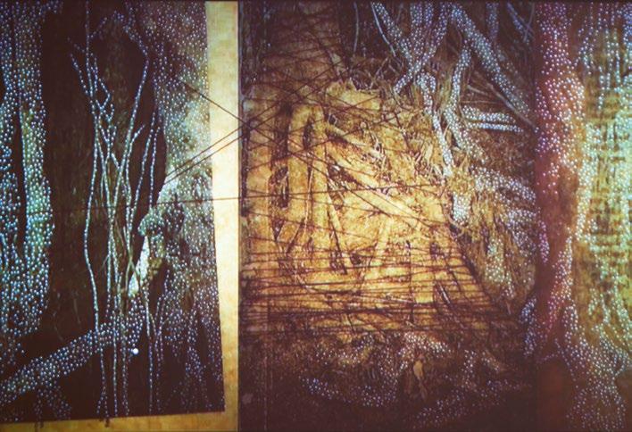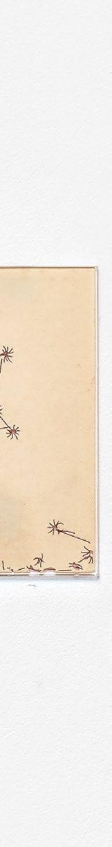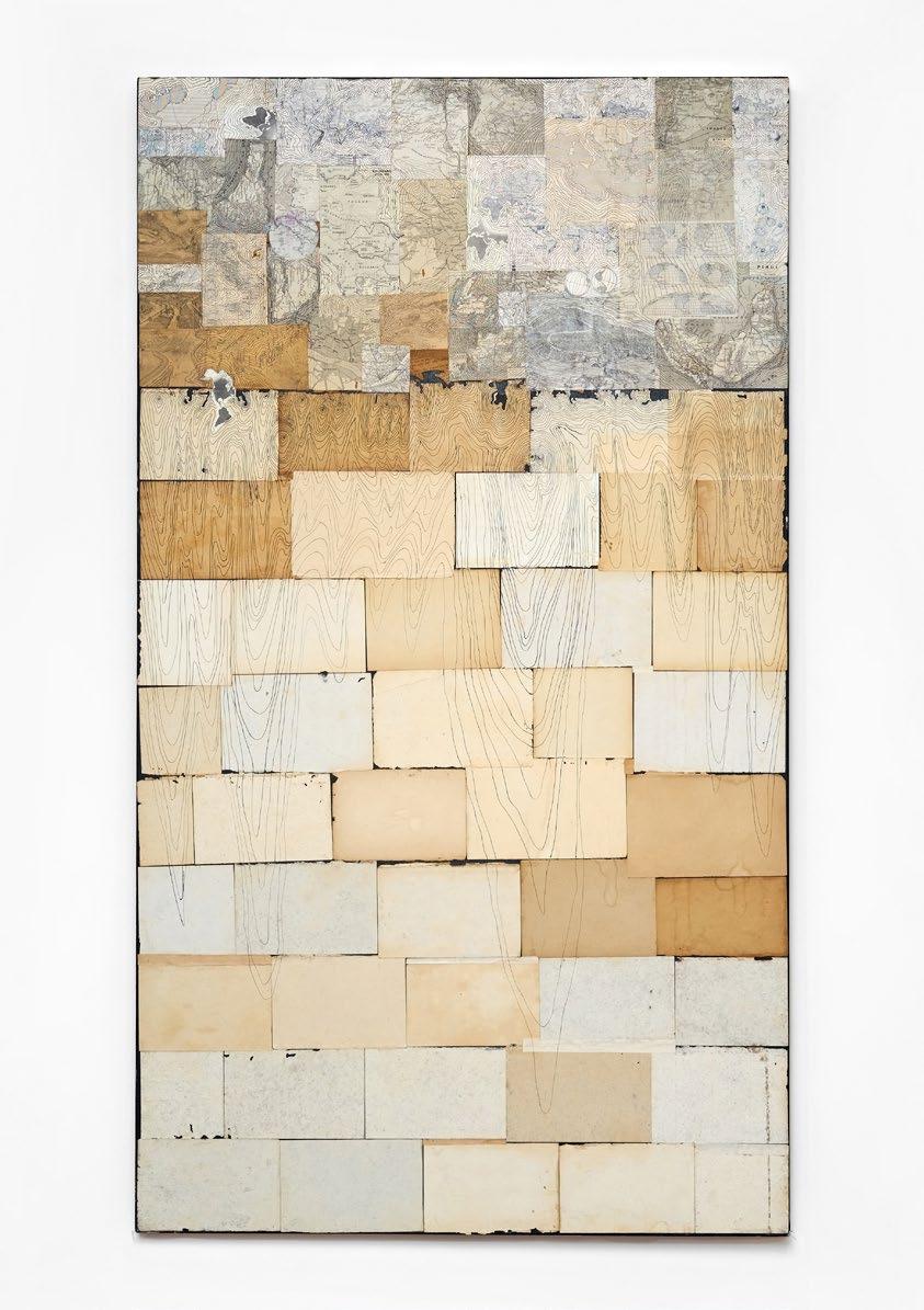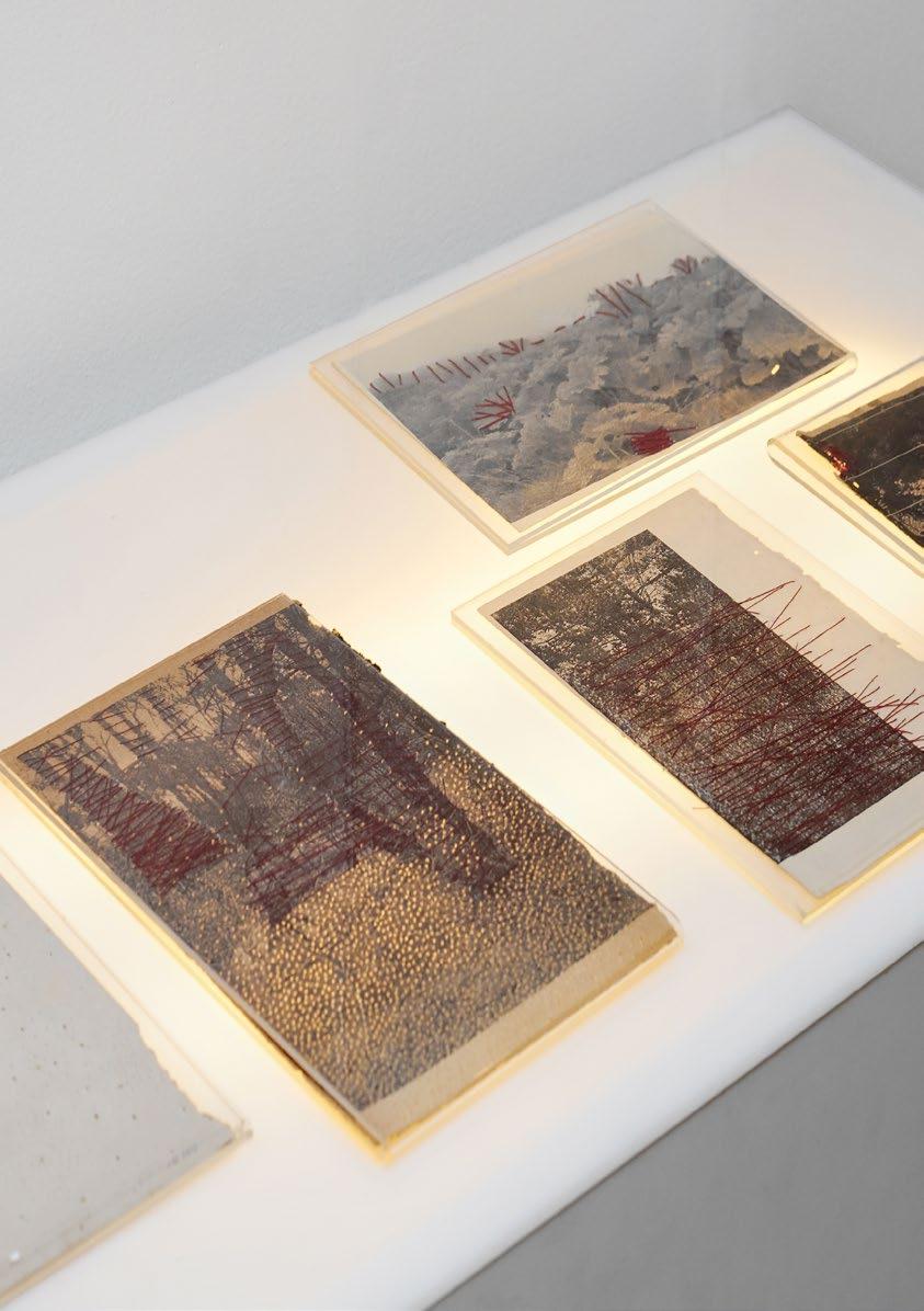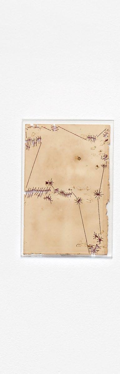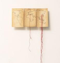 para pensar nosso modo de convívio com a vida vegetal, particularmente nossa responsabilidade em relação às florestas, de quem tanto dependemos, esquecendo-nos de que somos espécies entre espécies. Na outra metade do espaço expositivo, é possível reconhecer os mapas e as fronteiras como algo a ser pensado em termos planetários, bem como suas implicações para a continuidade da espécie humana. Livros decompostos pelos cupins e páginas ressignificadas por linhas que servem para cerzir e proteger, mas também para demarcar e limitar, apresentam-se como principal material trabalhado, além de se constituir como matéria para nos fazer refletir sobre as urgências do mundo e do tempo em que vivemos.