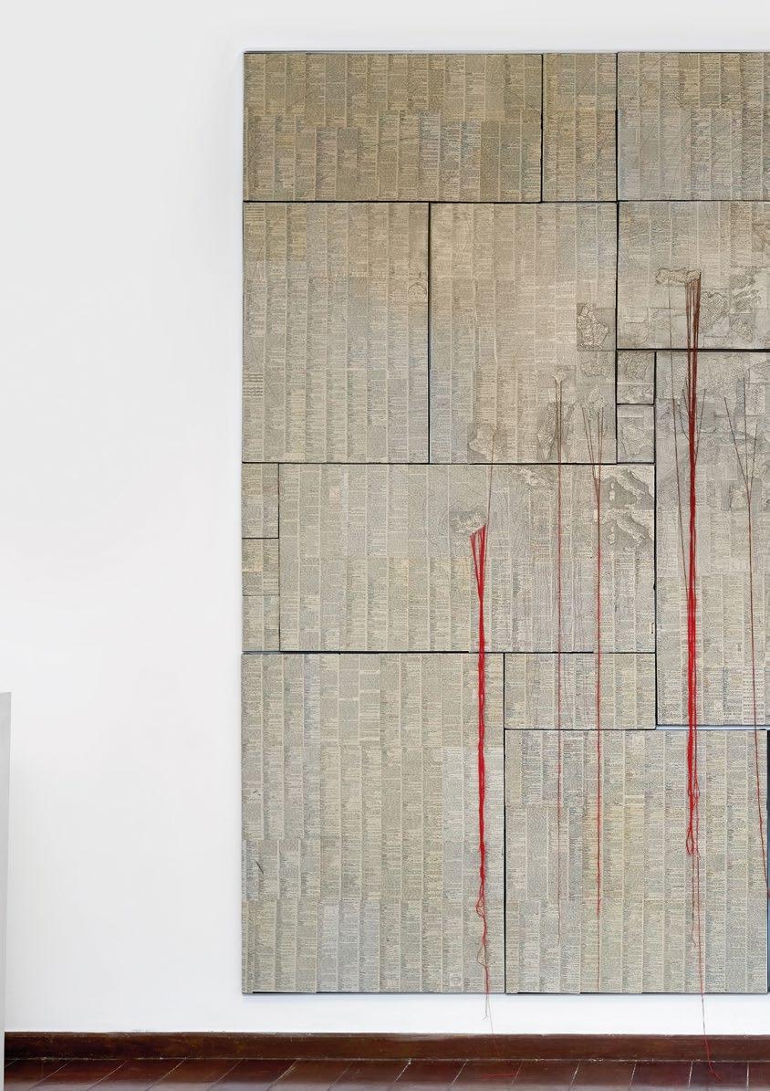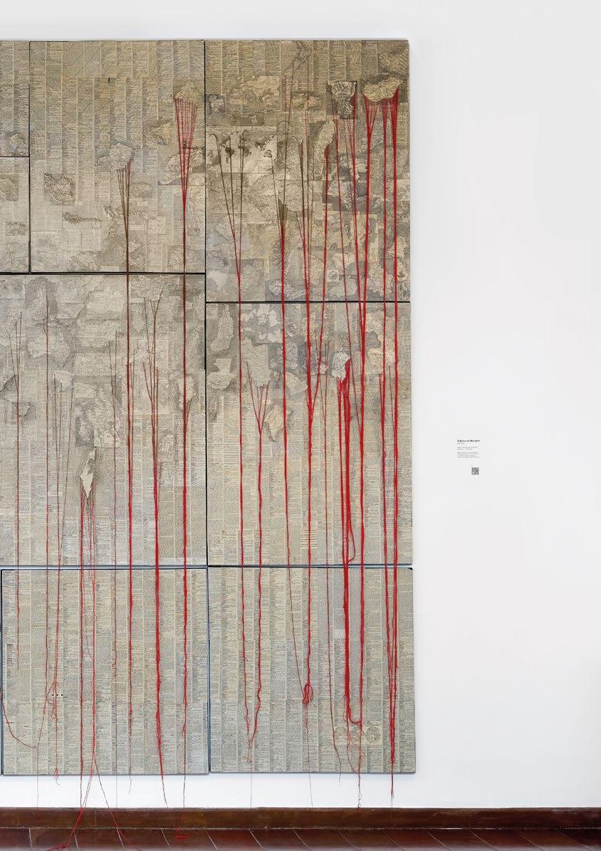 da Pandemia II, 2021. Série A Construção do Mundo Moderno – Fronteiras. Objeto: desenho de mapa sobre página de livro antigo e linhas vermelhas. Dimensão: 70 x 15 cm; À Beira da Margem, 2021/2022. Série A Construção do Mundo Moderno –Fronteiras. Vinte telas de tamanhos diferentes formando um painel de 280 x 280 cm. Técnica mista sobre tela – pintura, colagem, perfuração, desenho, bordado/ costura. Compõe um grande mosaico cujos mapas em P&B são páginas tiradas de um antigo dicionário enciclopédico ilustrado encontrado em uma caçamba de material de descarte, sendo depois arranjados aleatoriamente. Antes de serem colados, estes mapas foram todos perfurados com agulha, criando poros de respiros necessários. Sobre esta grande colagem, foram desenhadas linhas de propagações, contornando estas divisões geopolíticas como um mundo que vibra e pulsa. Das “fronteiras” ou margens destes “países” pendem linhas vermelhas. O mar, no entorno, é um mar de palavras, composto por verbetes de dicionário. Para finalizar a relação de obras expostas em Por um fio, desdobradas desde a exposição Exprimível do Vazio, emergem: Sem título, 2018. Série A Construção do Mundo Moderno – Ruínas. Nove objetos com 18 x 12 cm cada: bordado e perfuração sobre página de livro antigo; Sem título, 2019. Série A Construção do Mundo Moderno –Sobre Viventes. Backlight: impressão sobre quatro páginas de livro antigo, bordada e perfurada, medindo 30 x 21 cm cada; Sem título, 2019. Série A Construção do Mundo Moderno – Sobre Viventes. Instalação interativa: cinco páginas de livros antigos bordadas e perfuradas, cobertas com placas de acrílico e dispostas sobre bancada com backlight, medindo 18 x 12 cm cada. Estas páginas estão sobre uma bancada, podendo ser manuseadas; Para/To, 2019. Série A Construção do Mundo Moderno – Ruínas. Páginas de livros antigos com dedicatórias, medindo 18 x 12 cm cada; Avant Garde, 2020. Série A Construção do Mundo Moderno – Ruínas. Instalação com capas de livros antigos medindo 21 x 12 cm e 3 cm de espessura cada; Praias, 2021. Série A Construção do Mundo Moderno – Ruínas. Objeto: bordado sobre uma das páginas de um livro aberto e corroído por traças/cupins. Dimensão: 21 x 24 cm.