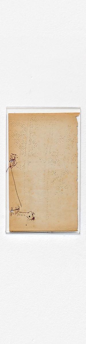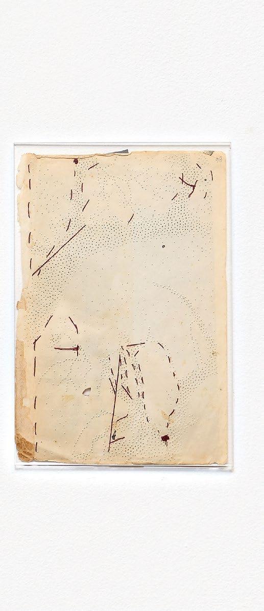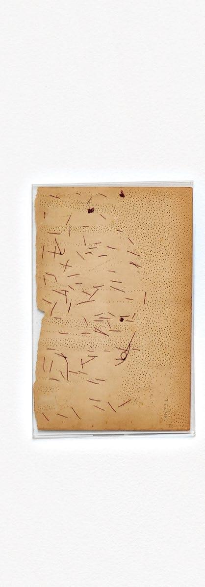 Justapondo este suposto monólogo, cabe destacar uma obra na qual a artista de Exaptações transformou um livro de música destroçado num objeto escultórico protegido por uma cúpula de acrílico e espalhou capas de livros numa parede, como se fosse uma constelação feita de pequenas pinturas ou um mostruário de ricos e coloridos brocados. Numa das salas expositivas criou, com espantosa firmeza de traços e obstinada repetição, conexões entre coisas díspares, circundando furos como ondas vibratórias expandidas até quase sua dissolução através das páginas. Distribuiu um conjunto daquelas que compunham outrora um livro atravessado pela ação dos cupins, vendo-as agora como partituras de uma meticulosa e silente sinfonia, iniciada por dois minúsculos pontinhos nas primeiras páginas e seguindo
