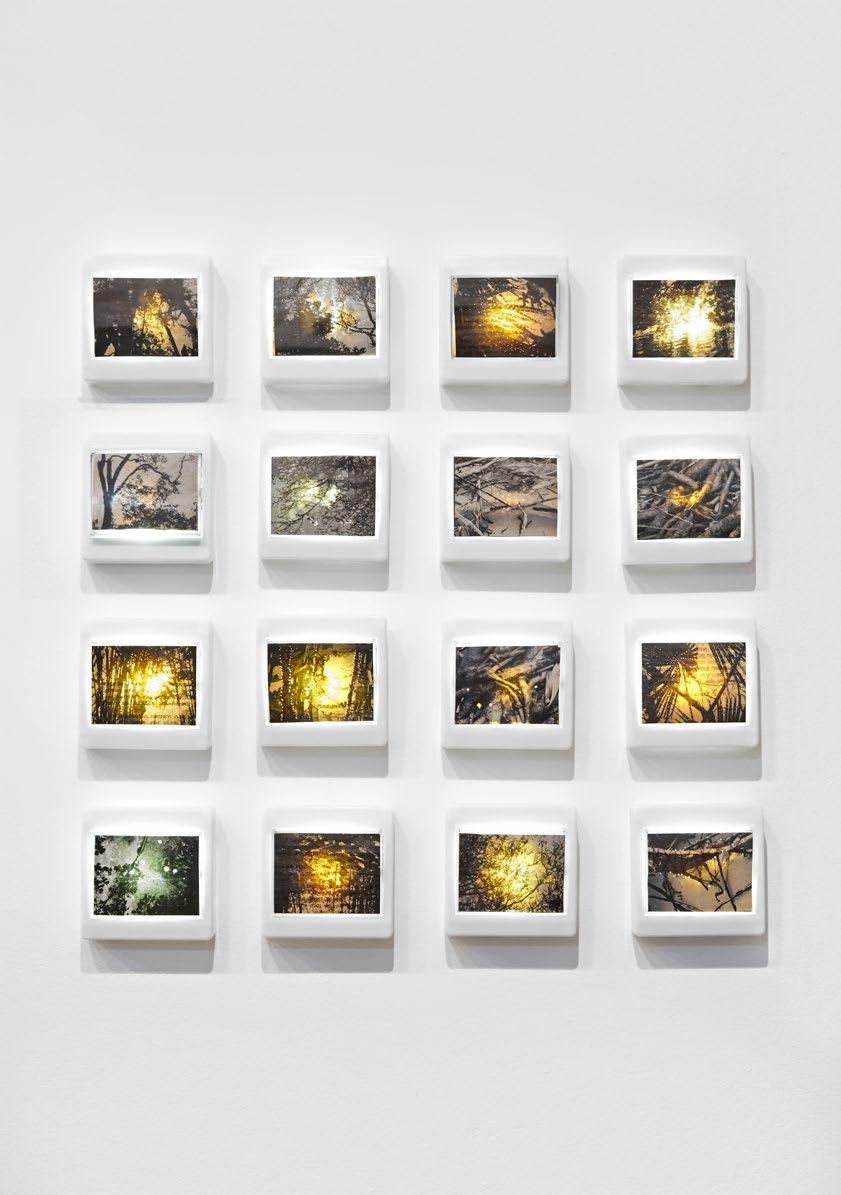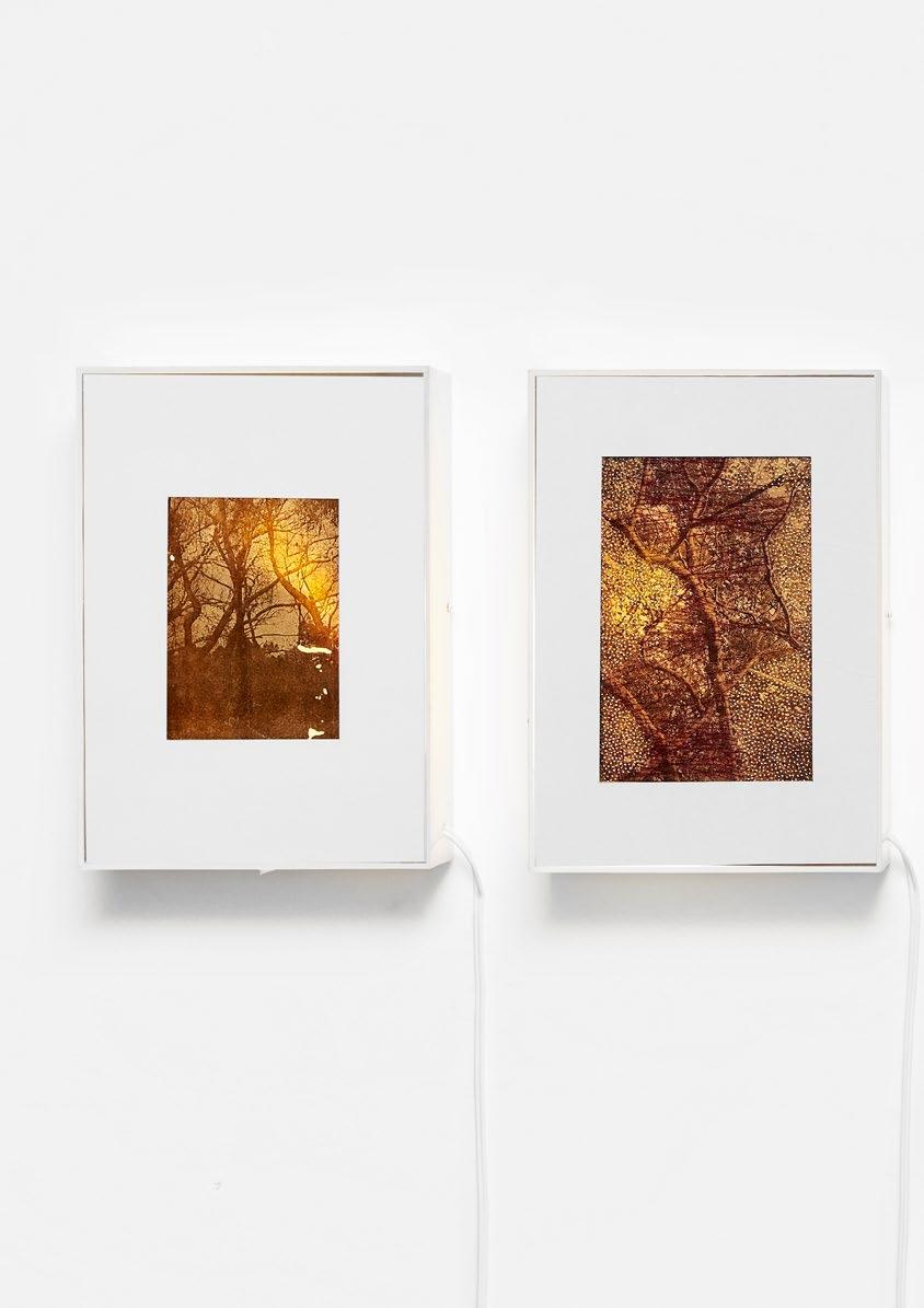 Ainda em 2019, na exposição Florestas 8 , Juliana Hoffmann prosseguiu a problemática da relação entre humanos e vegetais, embora trazendo trabalhos mais experimentais, tais como pinturas sobre folhas de papel arroz, vindas do alto da parede até se desenrolarem no chão, e caixas de luz, com páginas de livro pintadas, pontilhadas ou costuradas, cuja fiação elétrica ficava aparente, estendendo-se também pelo chão. Nos dois casos, o papel como vestígio material da árvore tanto ampliava a problemática da vida vegetal como a questão da vida para além do orgânico, em sua perpétua cambiância. Em relação às caixas apresentadas como retângulos verticais, contornadas pelas molduras brancas, estas remetiam a uma cenografia, cujas imagens lembravam poros, faíscas ou estrelas sob a forma de grãos de luz e de cor, tal como desenhos compondo distantes constelações, multiplicando a intencionalidade dos claros e escuros e dos minúsculos pontilhados, numa espécie de cosmogonia portátil, entre as escalas do micro e do macro, entre as dimensões do orgânico e do inorgânico. Sensível ao que perece, era a condição dos viventes que permanecia em questão. E era assim que as árvores como signo espectral seguiam deslindando a persistência e a transitoriedade daquilo que não cessa de nos interpelar.