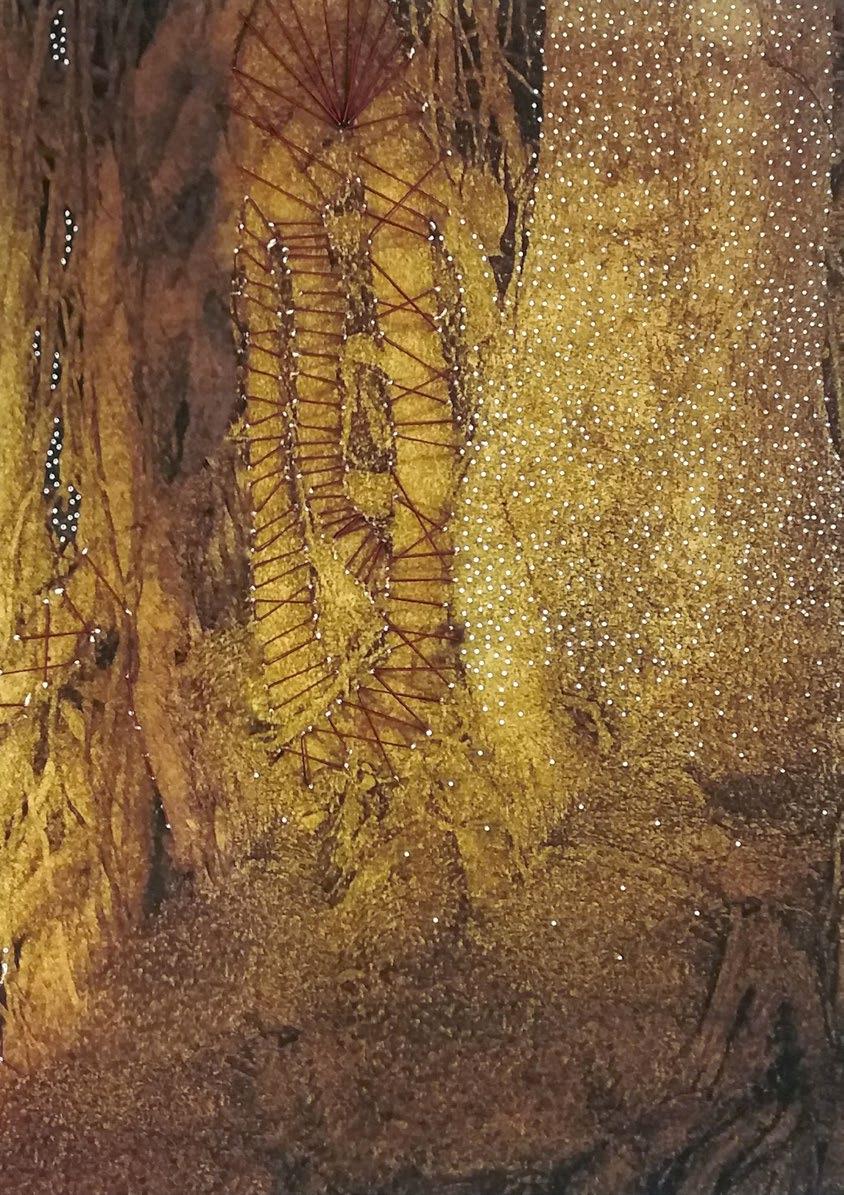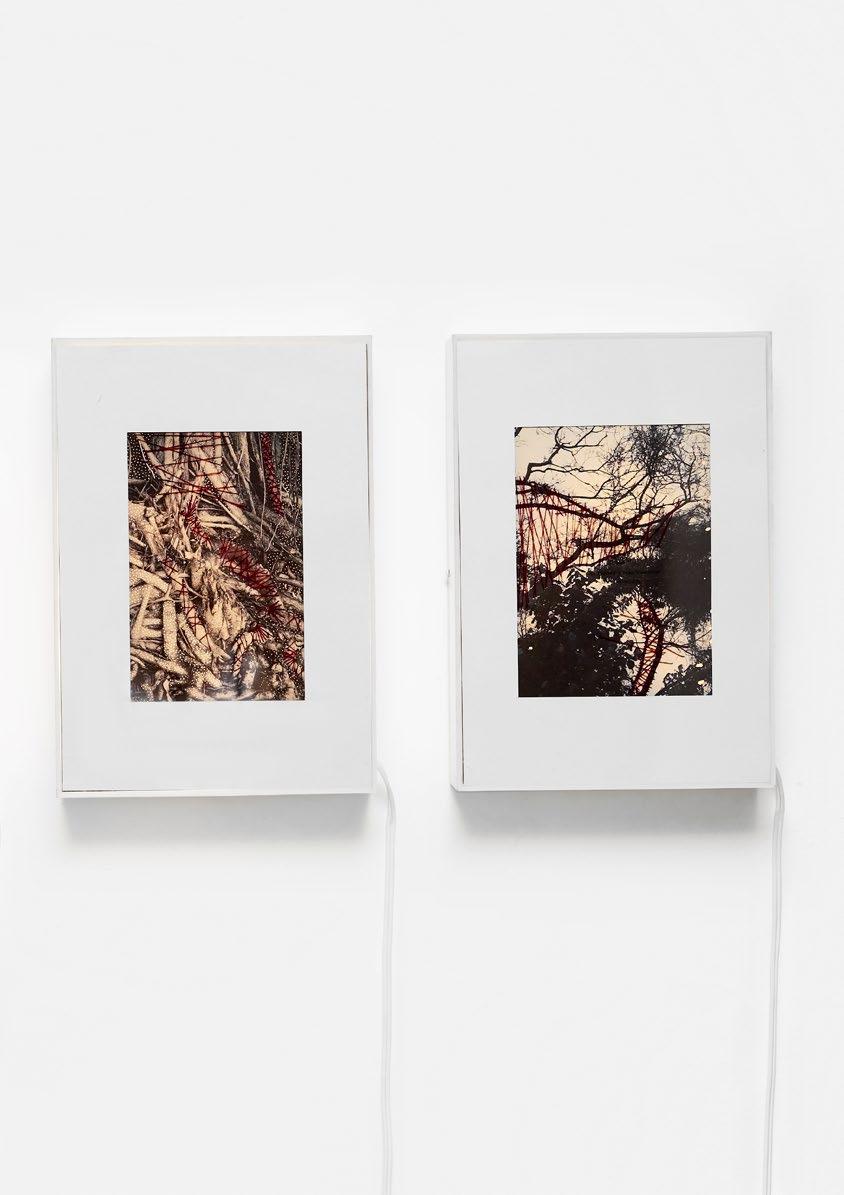 A temática nascia meses antes de proliferarem nos noticiários e reportagens denúncias de queimadas nas florestas brasileiras. Se a ausência humana seguia marcante nos trabalhos daquela ocasião, isto se devia ao fato de ser menos para assinalar um lugar intocado e mais para destacar um sistema que sobrevive sob ameaça e risco de extinção: conseguirão as formas de vida vegetal se recuperar antes de seus destruidores? Poderão estes sobreviver após extinguí-las? Entre as duas formas de vida, a humana e a vegetal, qual delas poderá se recuperar após o desaparecimento da outra? Além de pinturas com tinta acrílica sobre tela, compareciam fotografias impressas sobre páginas de livros antigos em caixas de luz, além de múltiplos com impressões em fine art e sobre acrílico. Cada obra dava a ver um gesto por onde eram construídas aproximações e afinidades entre desenho e bordado, entre contenção formal e desacato ornamental. Através de pontilhados, perfurações e tracejados, surgiam florestas noturnas, cujos troncos e galhos compunham estranhas torções, árvores respiravam pelos poros, deslindados por pequenos ponti-