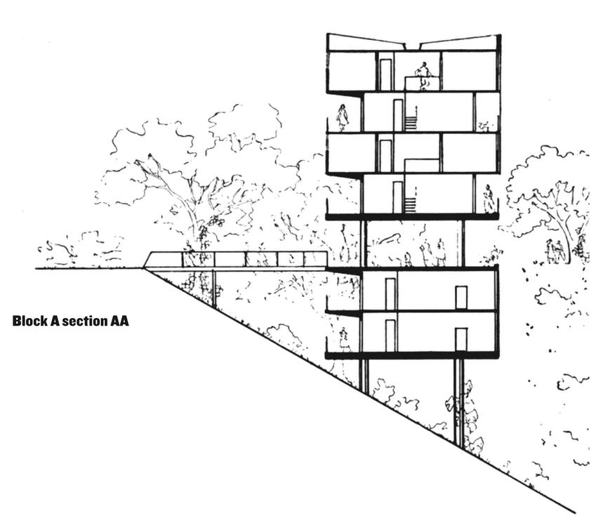 Ocupando um terreno de topografia muito acidentada, com uma variação de nível de 50 metros, o Projeto compreende quatro blocos habitacionais. O Bloco "A" de 260 metros de extensão, que acompanha a encosta do morro de forma sinuosa, inclui 272 apartamentos . Os dois pavimentos inferiores contêm apartamentos estilo “studio”, enquanto os superioresabrigamapartamentosduplexdeumoudoisdormitórios.