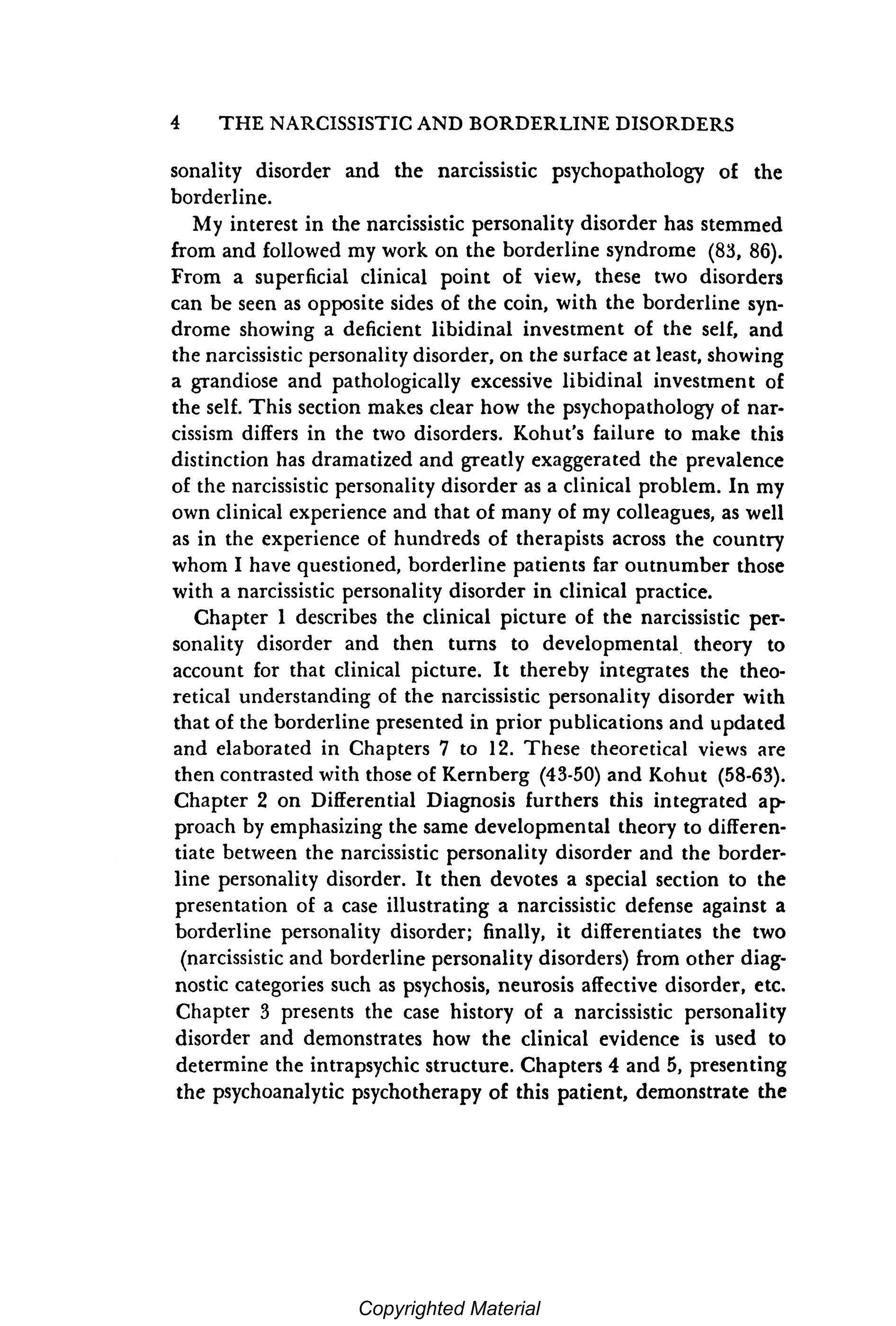 Chapter 1 describes the clinical picture of the narcissistic personality disorder and then turns to developmental theory to account for that clinical picture. It thereby integrates the theoretical understanding of the narcissistic personality disorder with that of the borderline presented in prior publications and updated and elaborated in Chapters 7 to 12. These theoretical views are then contrasted with those of Kern berg (43-50) and Kohut (58-63).