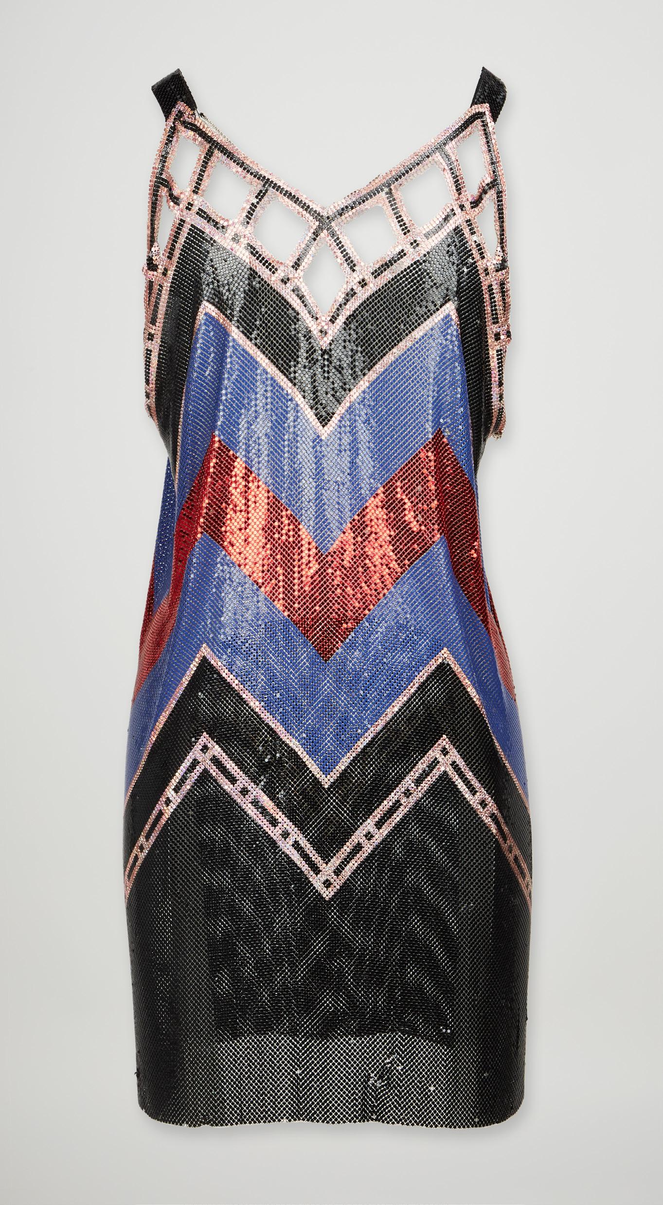 Paco Rabanne’s 1999 Spring Haute Couture chain mail cocktail dress is a testament to the designer’s unconventional vision. Crafted from a mesh of red, blue, pink, and black chevrons, this sheath-style dress is a symphony of color and texture. It’s a piece that commands attention, a reminder that fashion can be both beautiful and provocative.