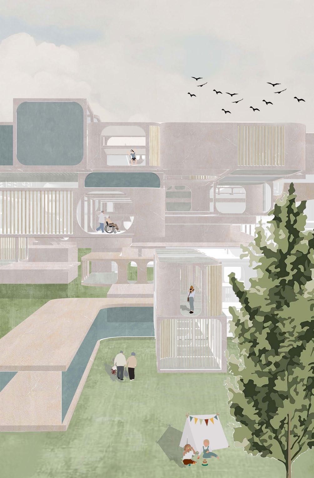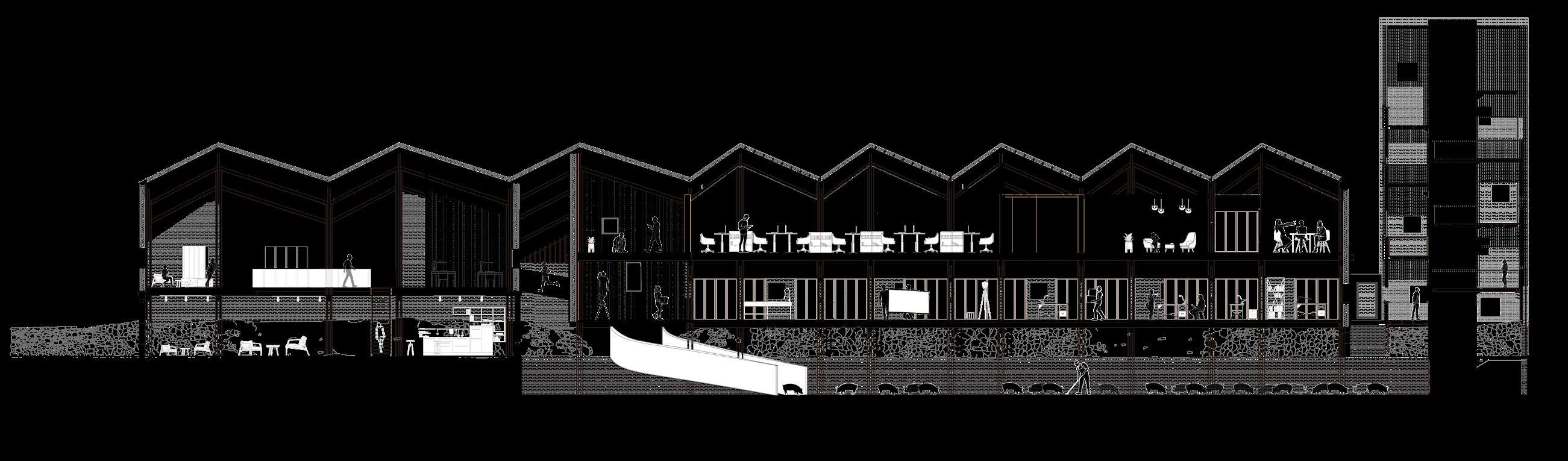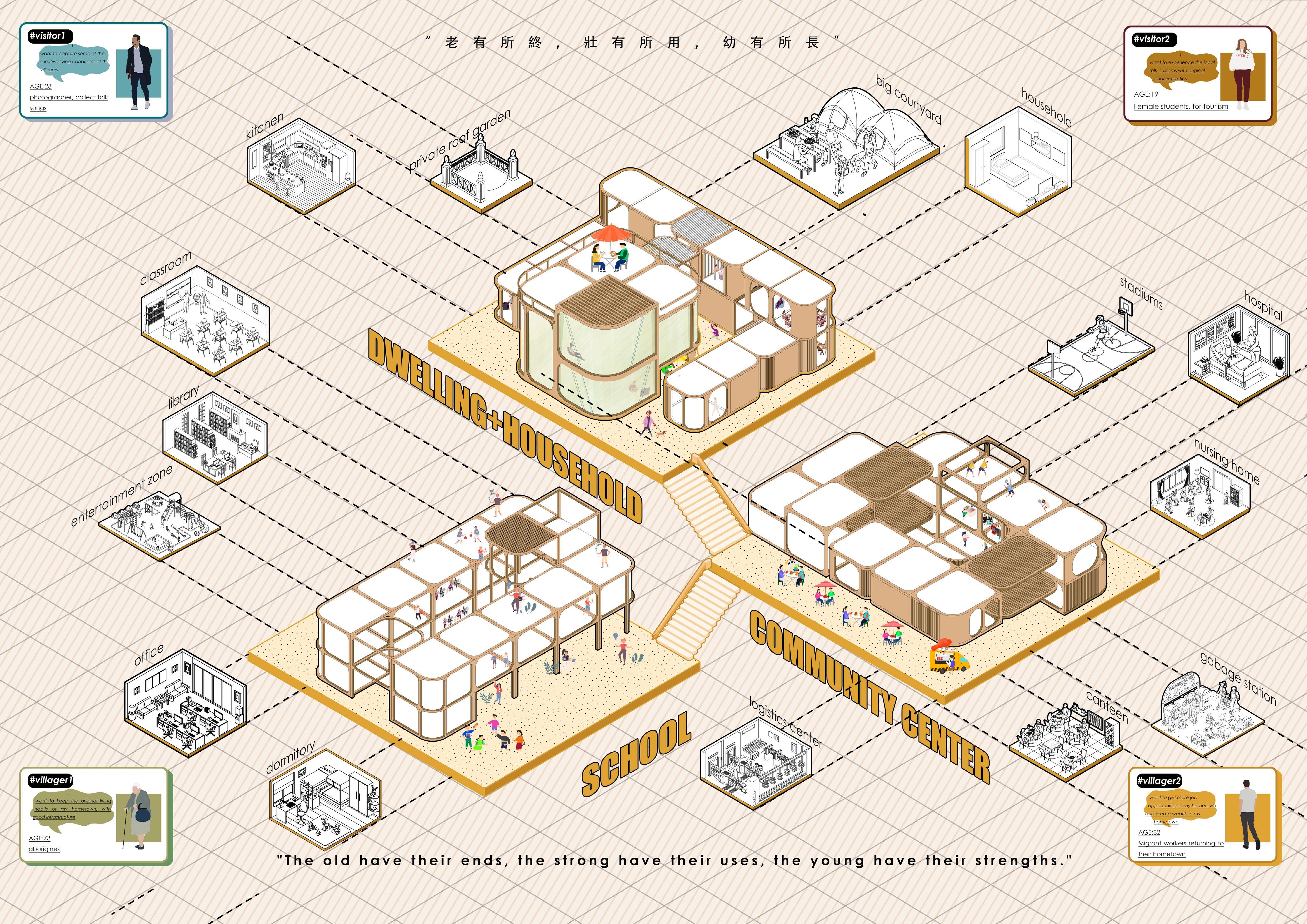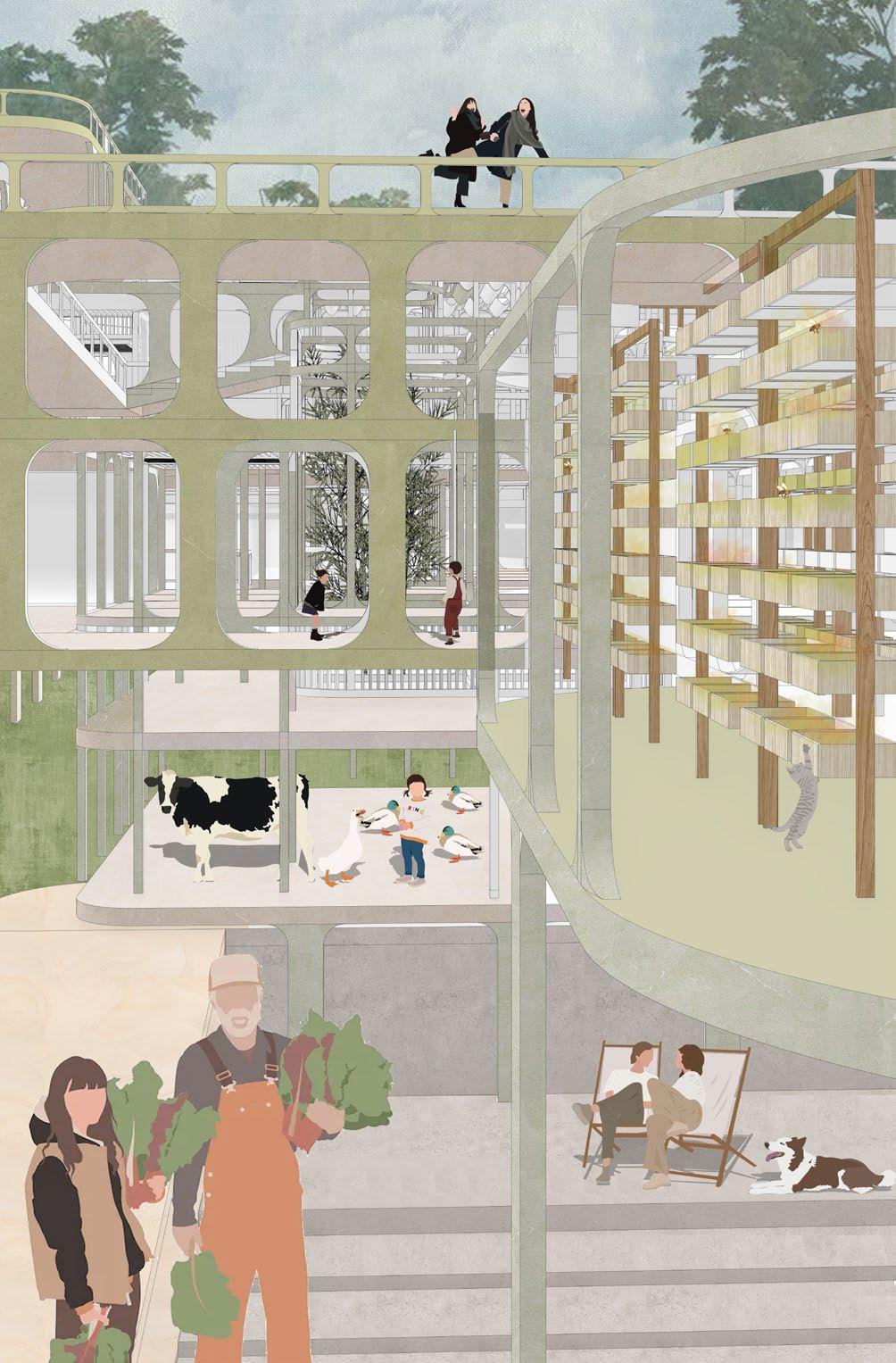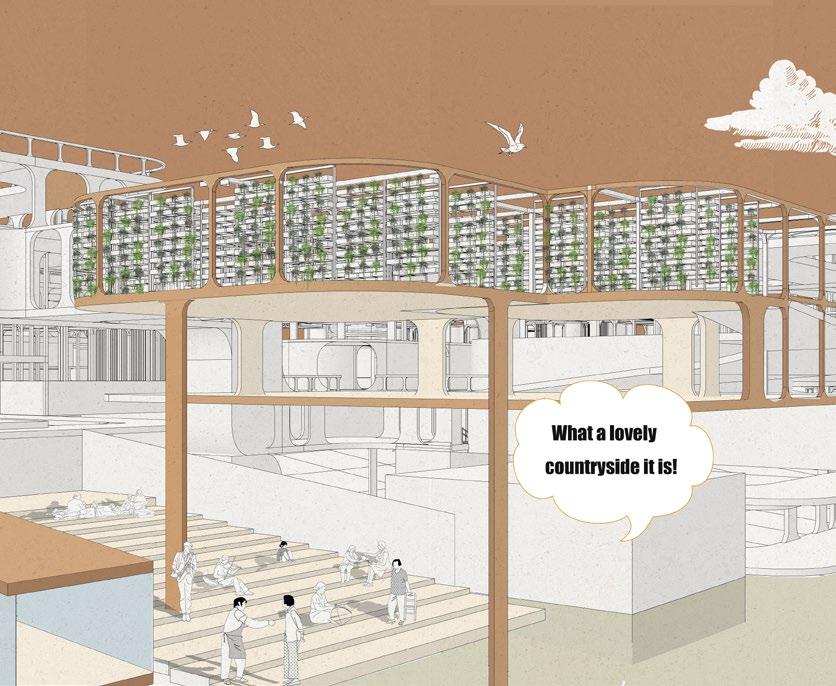 The whole project addresses the proposed development path of rural inclusion, starting from the common problems of the countryside and identifying the root cause of the problems in the countryside - the urban-rural dichotomy. The main aim of the design is to break the urbanrural dichotomy and to use the strategy of industrial integration to meet the respective needs of residents and visitors. To accommodate the need for a universal solution, the whole is modular in form, containing a series of base units and undefined modules which removes the labelling of the countryside and allows it to be freely reorganised into complete ecological and industrial chains.