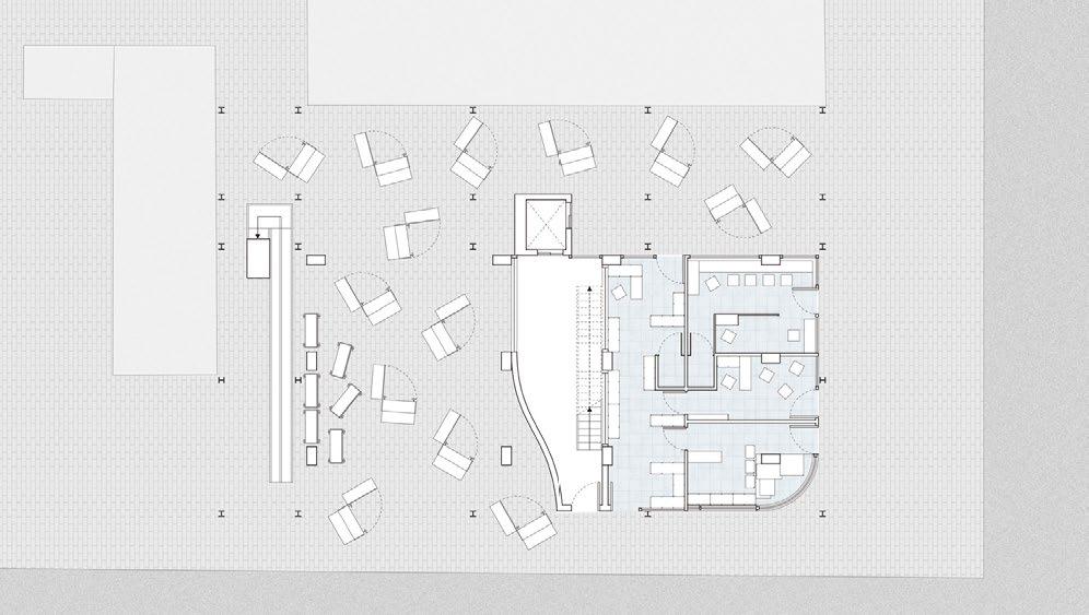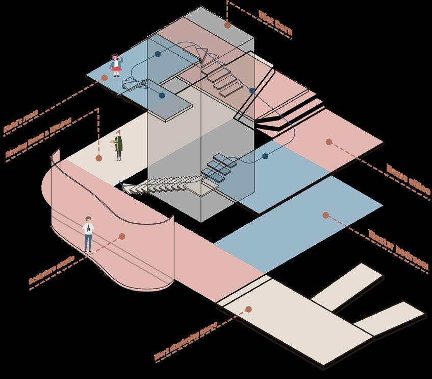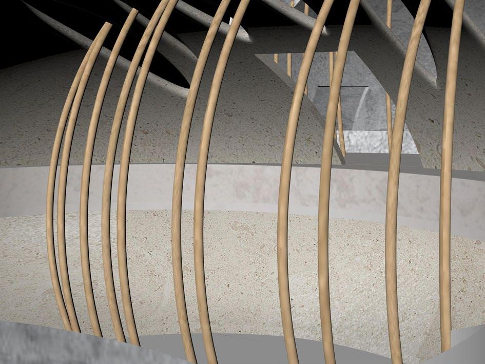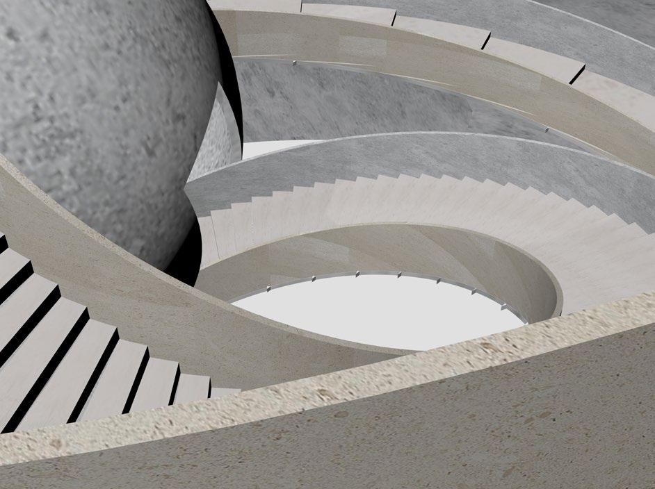 The ground floor of the first sphere is a screening hall to deepen and introduce and set the scene for the event At the same time the sphere of the rotating staircase is fused with the second event.
