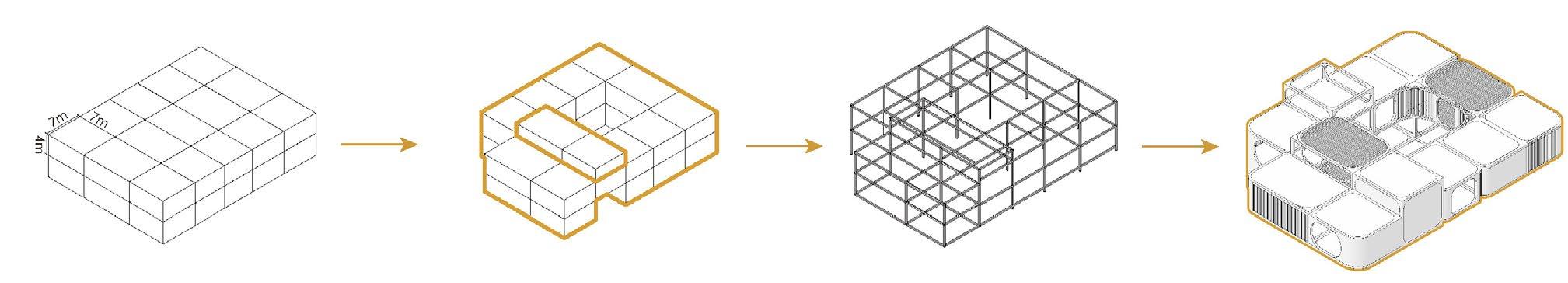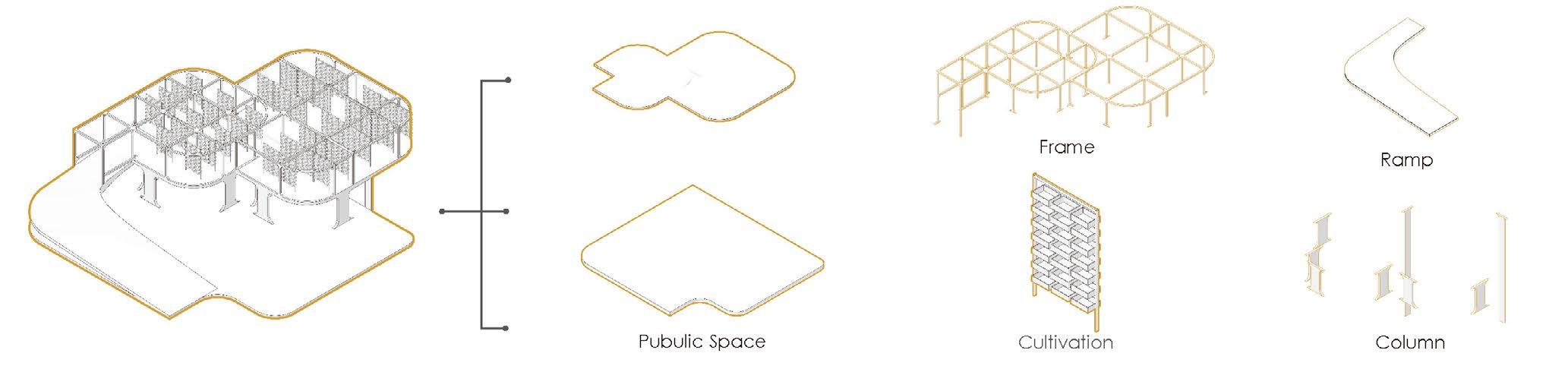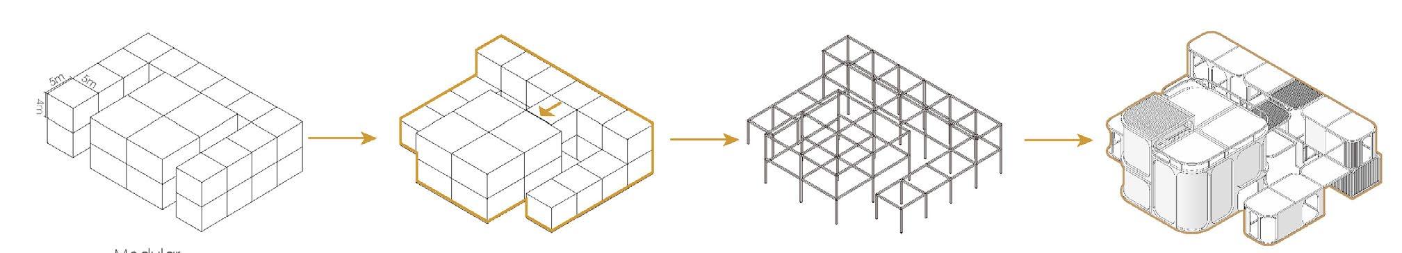 - Each defined functional block is stacked and spliced to form a unique architectural system, match the concept of industrial trinity. Some of the individual buildings are developed from modular frames into single buildings and then connected by pedestrian walkways or markets. Remove labels and reorganize the functions of the traditional rural.