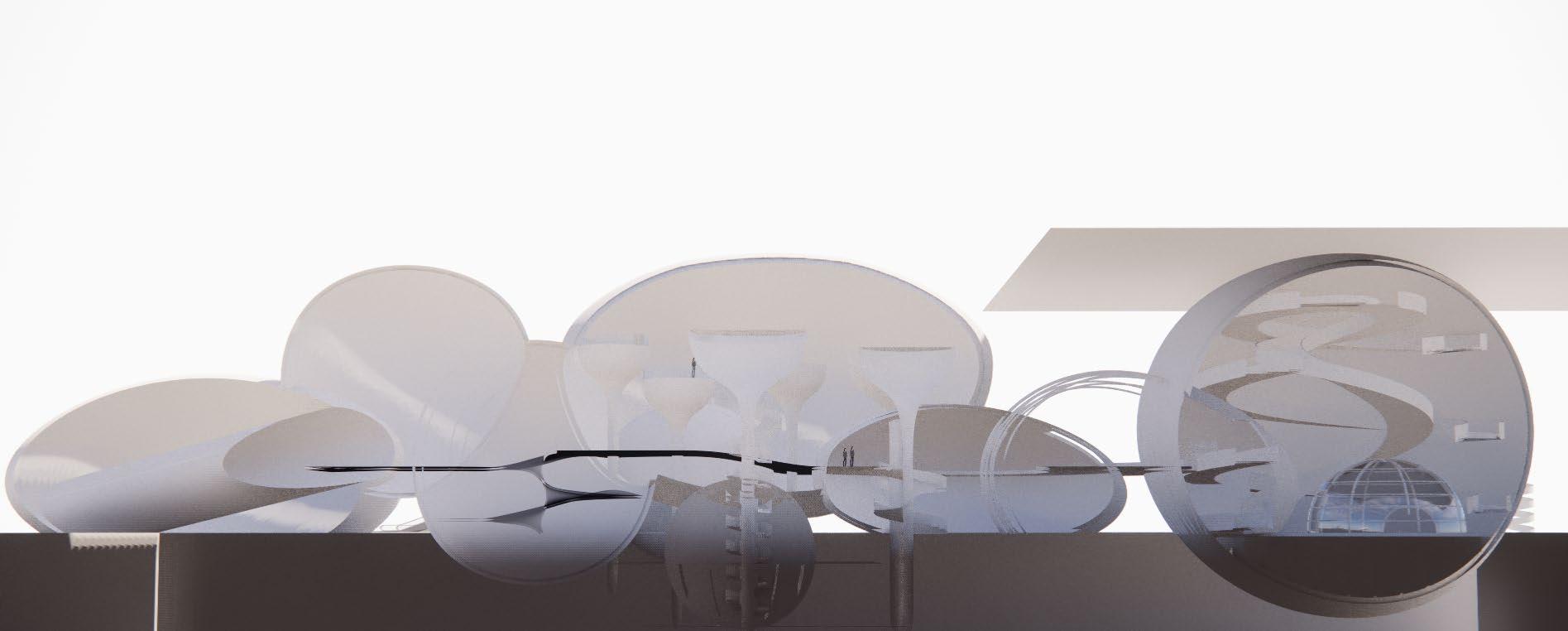1. People enter from the ground floor, and people hover up along the edges of the sphere without touching the central part of the sphere, giving a sense of inaccessibility.
