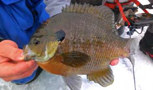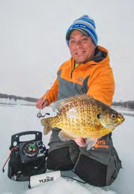 Hungry bluegills often suspend low in the water column. “You’ll see them 2-5’ off the bottom. Sometimes, you can watch them compete for your lure on the flasher – that’s when you can really wail on them.”