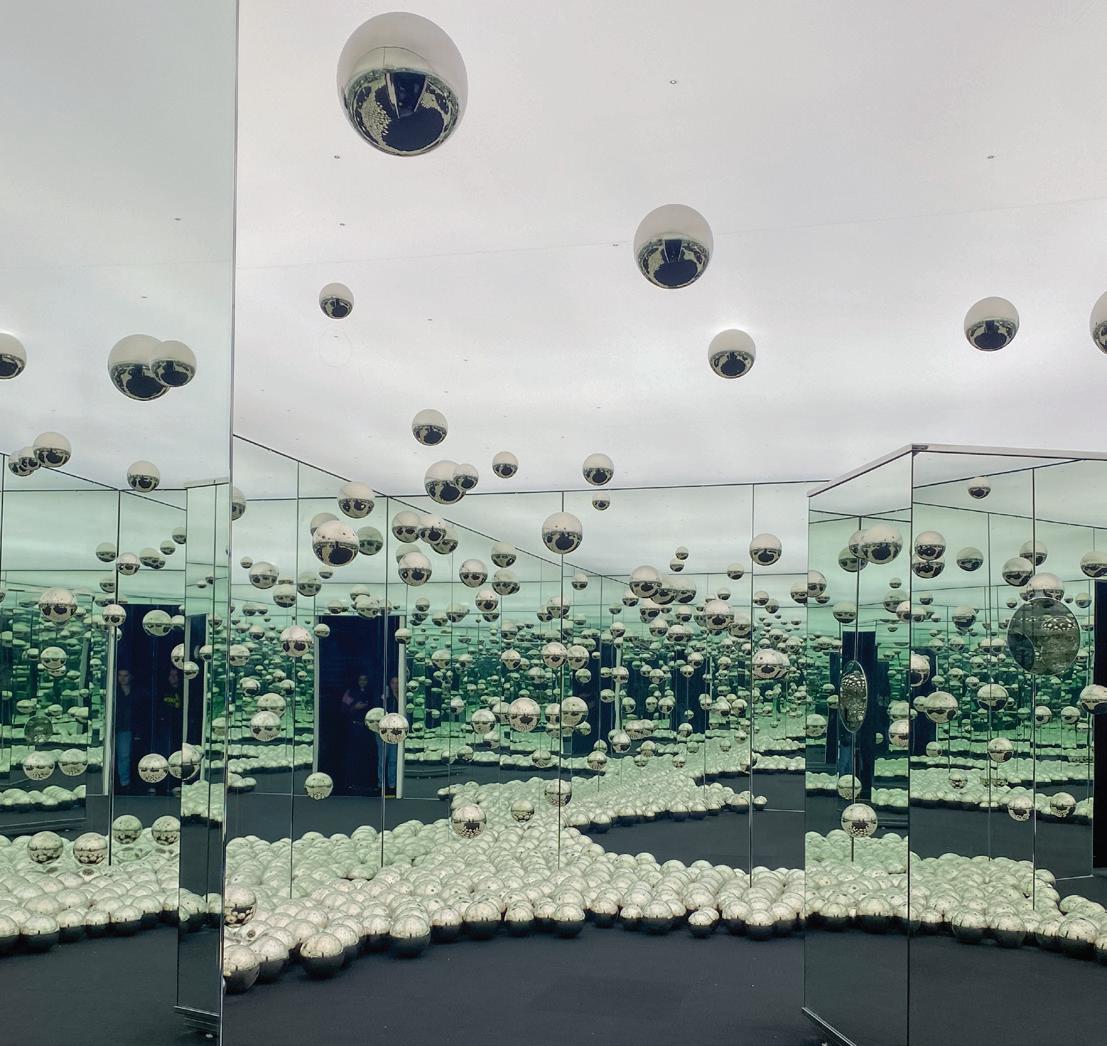 The last exhibition we are highlighting is Yayoi Kusama’s “Let’s Survive Forever.” This installation is a room with floor to ceiling mirrors affixed to every wall — including the ceiling — filled