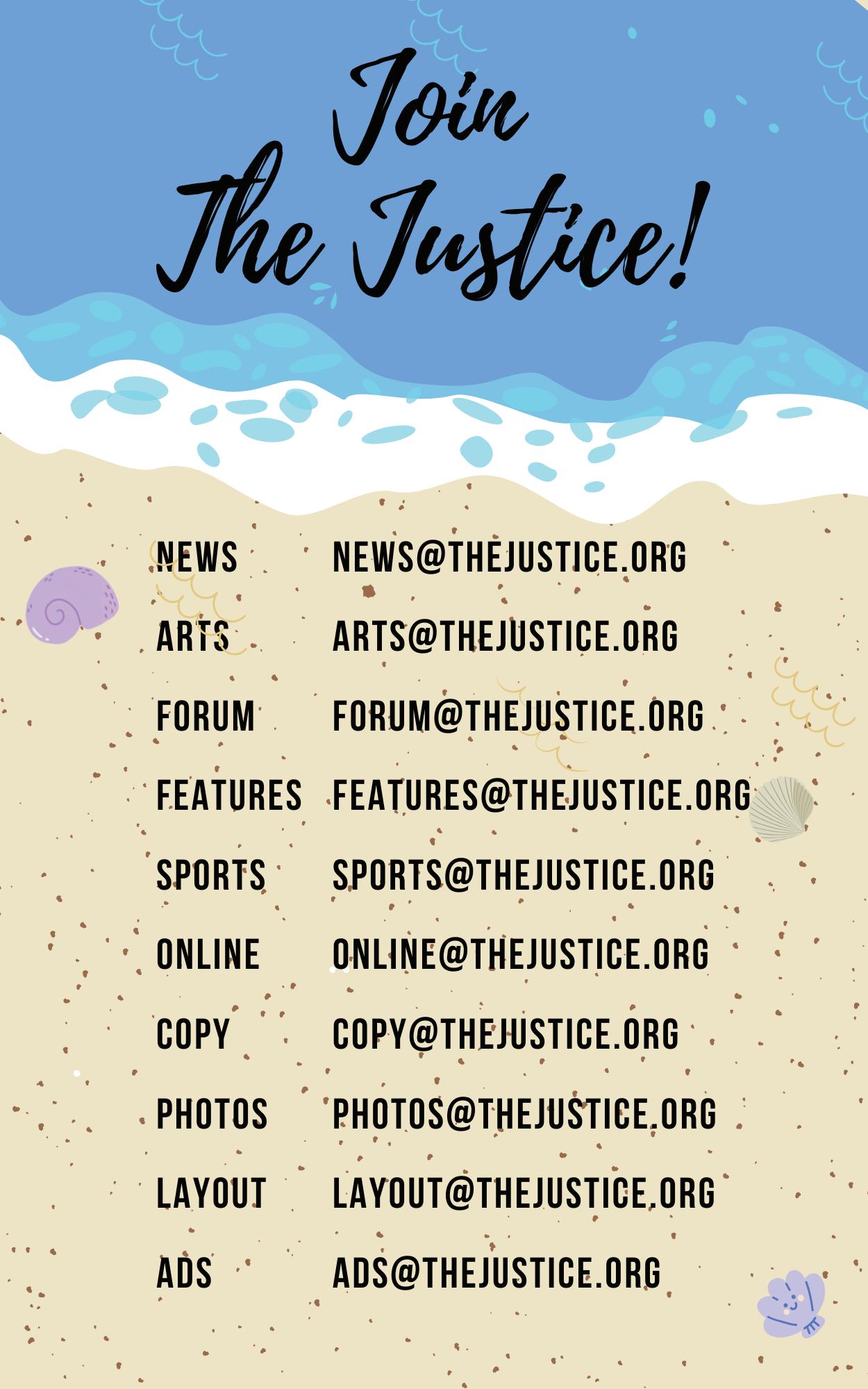 Media editor@thejustice.org managing@thejustice.org news@thejustice.org features@thejustice.org forum@thejustice.org sports@thejustice.org arts@thejustice.org photos@thejustice.org copy@thejustice.org layout@thejustice.org ads@thejustice.org online@thejustice.org