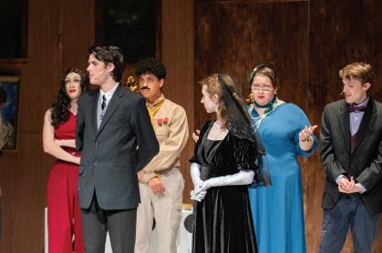 sor Plum with a lot of extra flair and emotion. With some excellent comedic pacing and vibrant facial expressions, Holcomb always held the stage with his one-liners. Casadie Parent ’27 played the wicked Mrs. White, who is the only character not dressed as their name, instead sporting a frightening black gown. They also held the stage with one-liners, but her comments presented a lot more violence than Plum’s sarcasm. Next, there was the unexpected dynamic duo, Colonel Mustard and Miss Scarlet, played by Xavián Plasencia ’28 and Sean Walker ’28. Plasencia and Walker played total opposites, Plasencia a moronic and bumbling Mustard and Walker a clever and suave Scarlet, but the characters seemed to develop a delightfully strange friendship by the end of the play. The ensemble also gave vibrant and varied performances, with their best kerfuffle happening at the very end of the play in a way that had me and others in the audience rolling. Alexandra Brichkov ’29, who played Mrs. Peacock, was a perfect mix of chatty, annoying and over the top. Brichkov made every new twist and turn in the story just a little more ridiculous and her constant drinking after insisting she doesn’t touch alcohol was probably the best continuing gag.