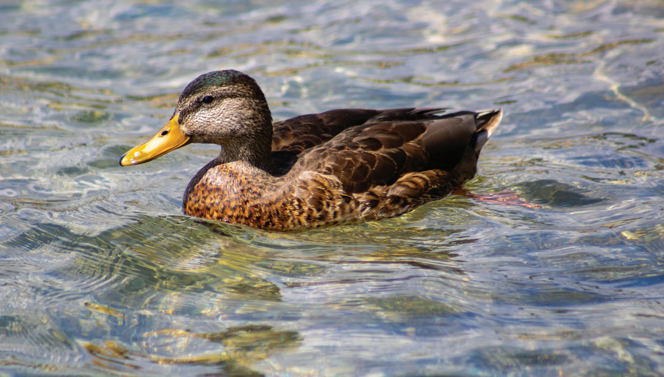 RESTING : A duck floats across the glistening water.