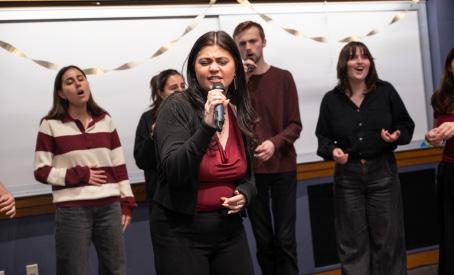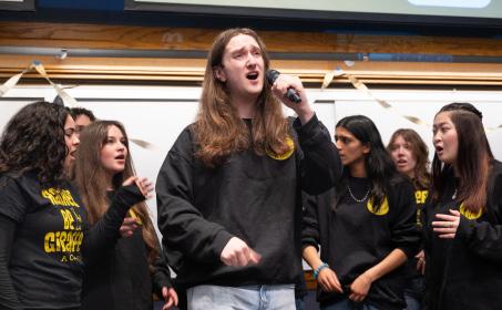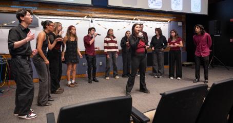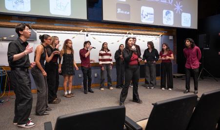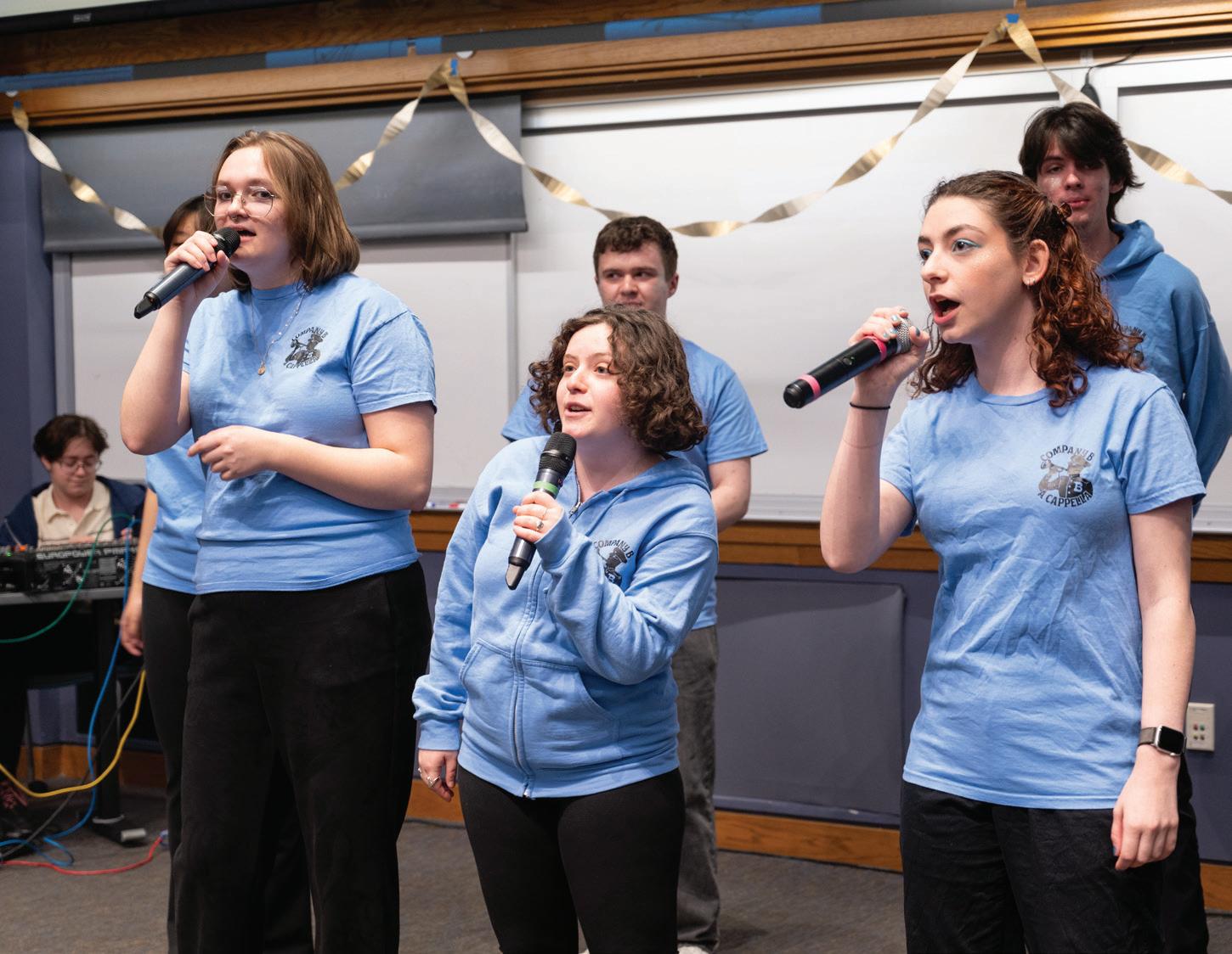 Confino-Miller: When planning Acappellooza, the biggest challenge is coordinating a date that works for all of the a cappella groups. Once the date is set, we secure a venue and organize logistics, including having each group sign up for designated soundcheck slots and coordinating with Student production se rvices to handle microphones and run soundchecks. On the day of the performance, we decorated the venue to create a lively, engaging atmosphere. I designed promotional graphics, hu ng posters, and created a detailed program that includes each group’s setlist, soloists, arrangers, and additional performance details. I also secured an emcee to introduce the show an d keep it running smoothly.