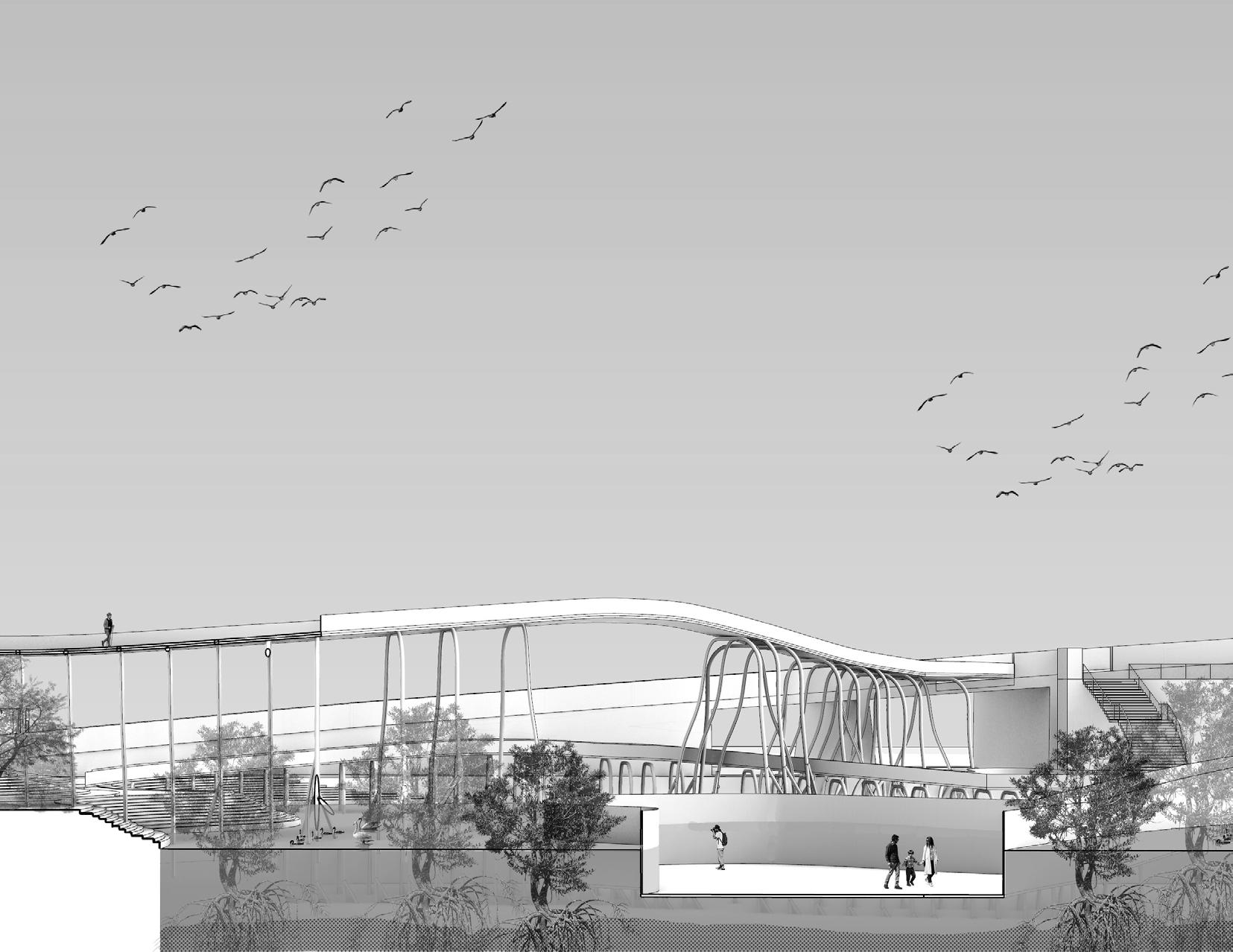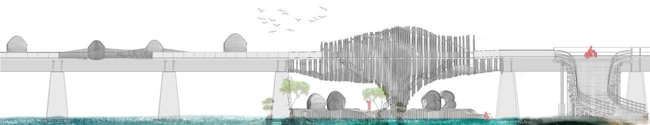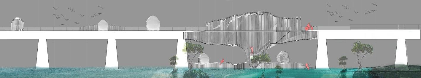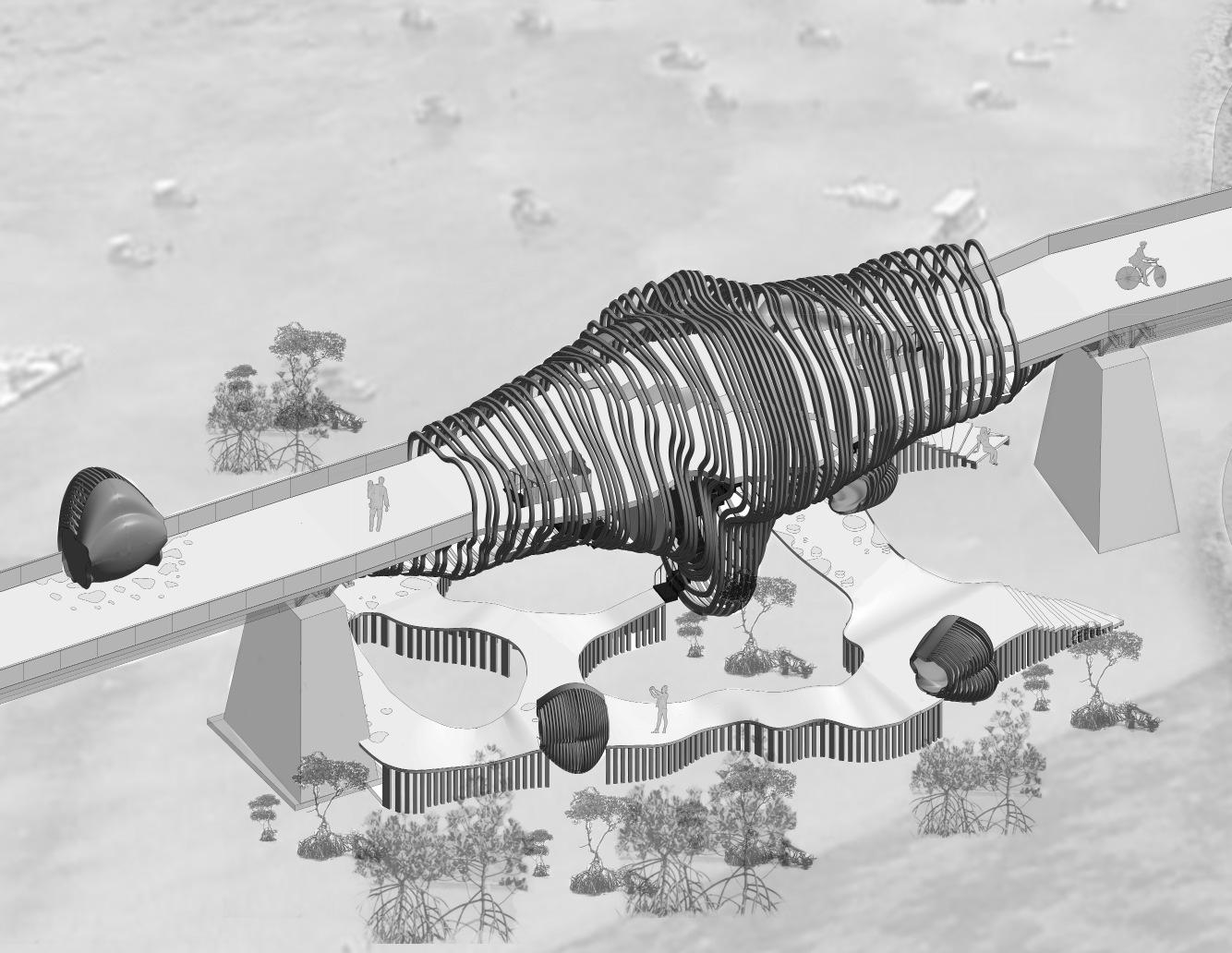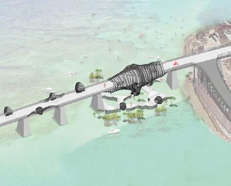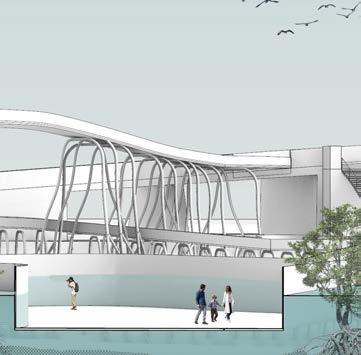 INTERACTIVE DESCENDING PATHS – THESE PATHWAYS LEAD VISITORS BELOW THE WATER’S SURFACE, EXPOSING THE HEALTH AND ACTIVITY OF THE MANGROVE ECOSYSTEM, INCLUDING FISH NURSERIES.