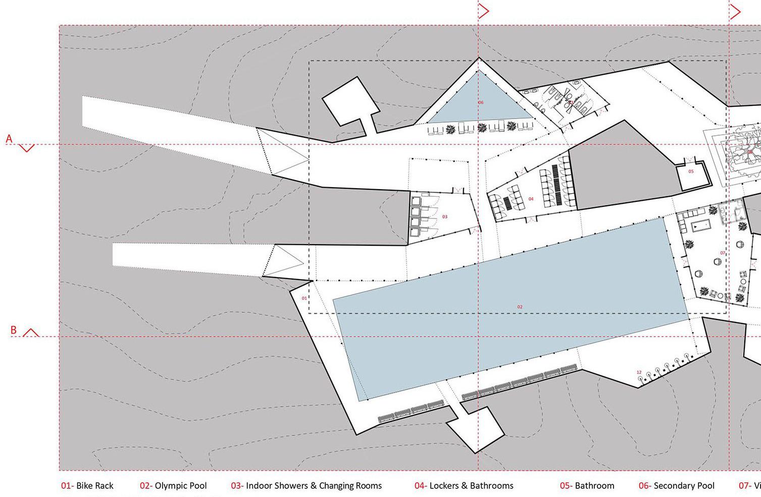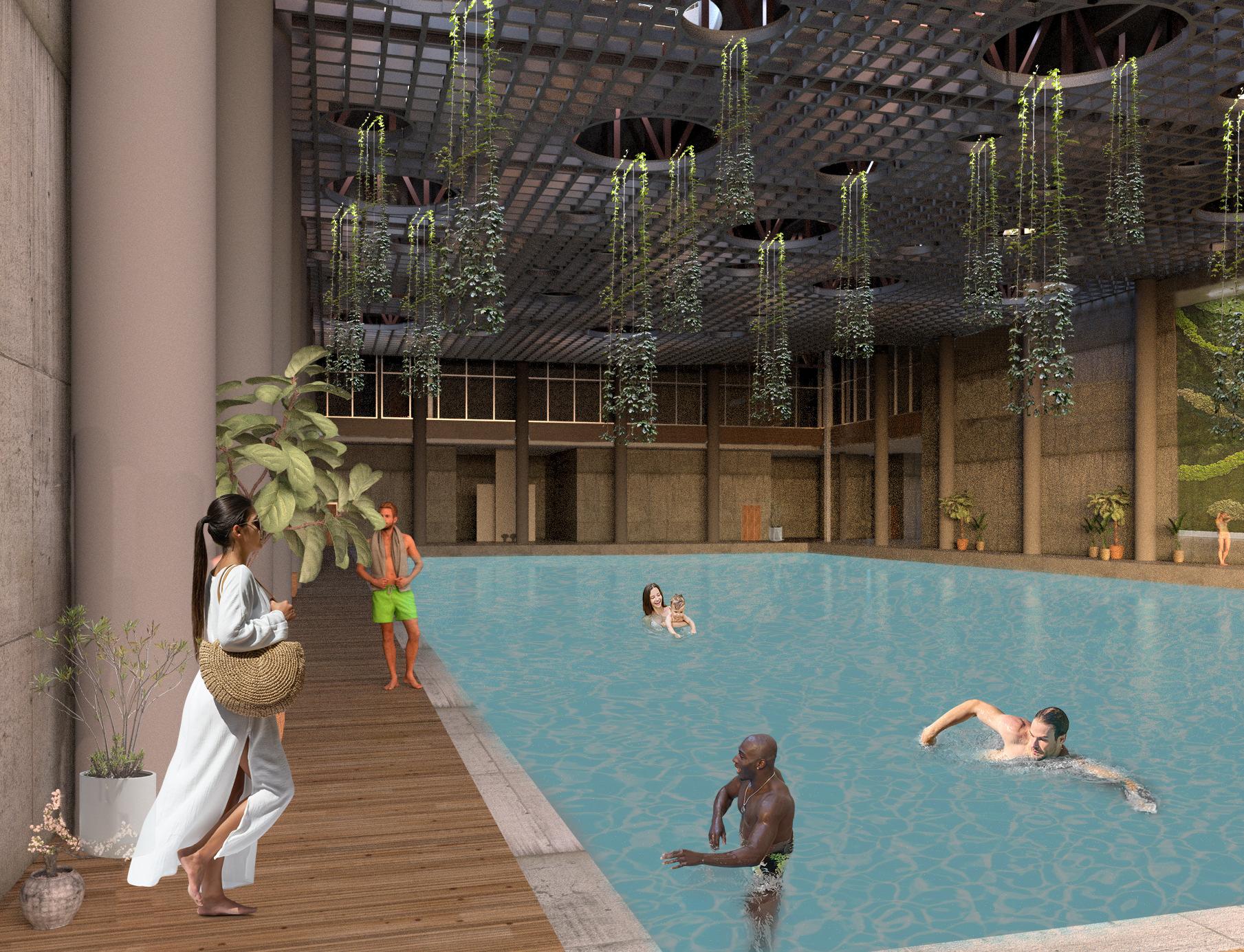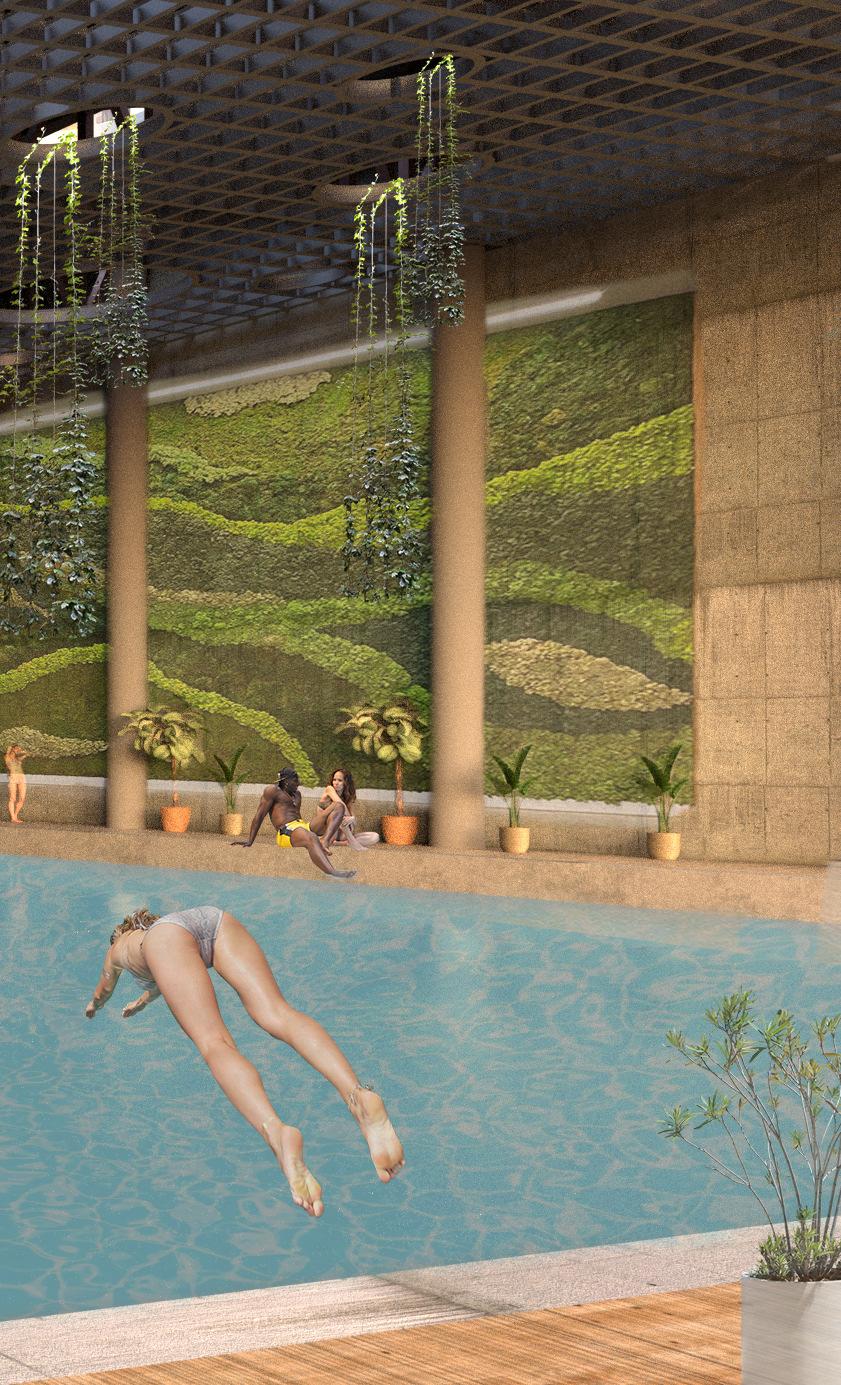 IN THE HEART OF OUR COMMUNITY, A LIVING CANVAS UNFOLDS—A VISIONARY COMMUNITY CENTER CONCEIVED FROM THE VERY ESSENCE OF LIMESTONE'S POROUS POETRY. HERE, THE CONVENTIONAL BOUNDARIES OF INSIDE AND OUTSIDE CONVERGE, AS THE STRUCTURE BREATHES LIFE, INVITING THE NATURAL WORLD TO DANCE WITHIN ITS WALLS WHILE EMBRACING THE LOCAL ECOSYSTEM. SOURCED FROM THE QUARRIES OF FLORIDA, THE OCALA LIMESTONE EMBODIES A COLLECTIVE NARRATIVE, FOSTERING A PROFOUND SENSE OF BELONGING AMONG THE INHABITANTS. THE PLAY OF LIGHT, INSPIRED BY LIMESTONE’S INTRICATE POROSITY, PAINTS A CHOREOGRAPHY WITH CIRCULAR MOTIFS OF VARIED DIAMETERS, CASTING A PLAYFUL SPELL UPON THE IMMERSIVE COMMUNITY CENTER. THE NATATORIUM PROVIDES SPACES TO GATHER AND BLENDS THE LINES BETWEEN INTERIOR AND EXTERIOR REMINDING THE VISITORS THAT WE ARE ALWAYS SURROUNDED BY LIFE AND LIGHT.