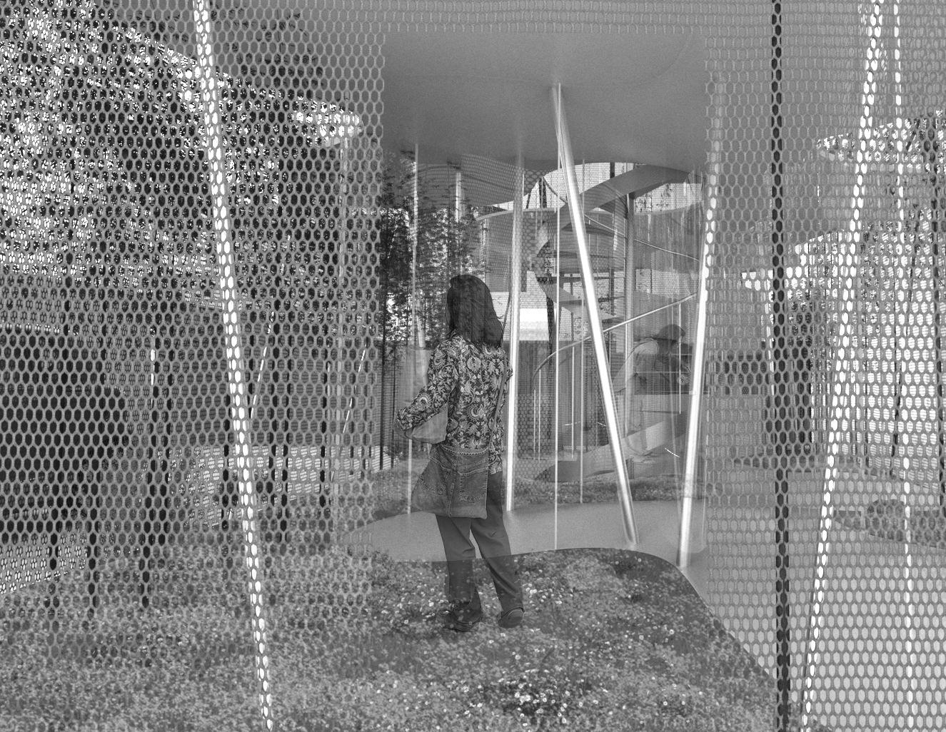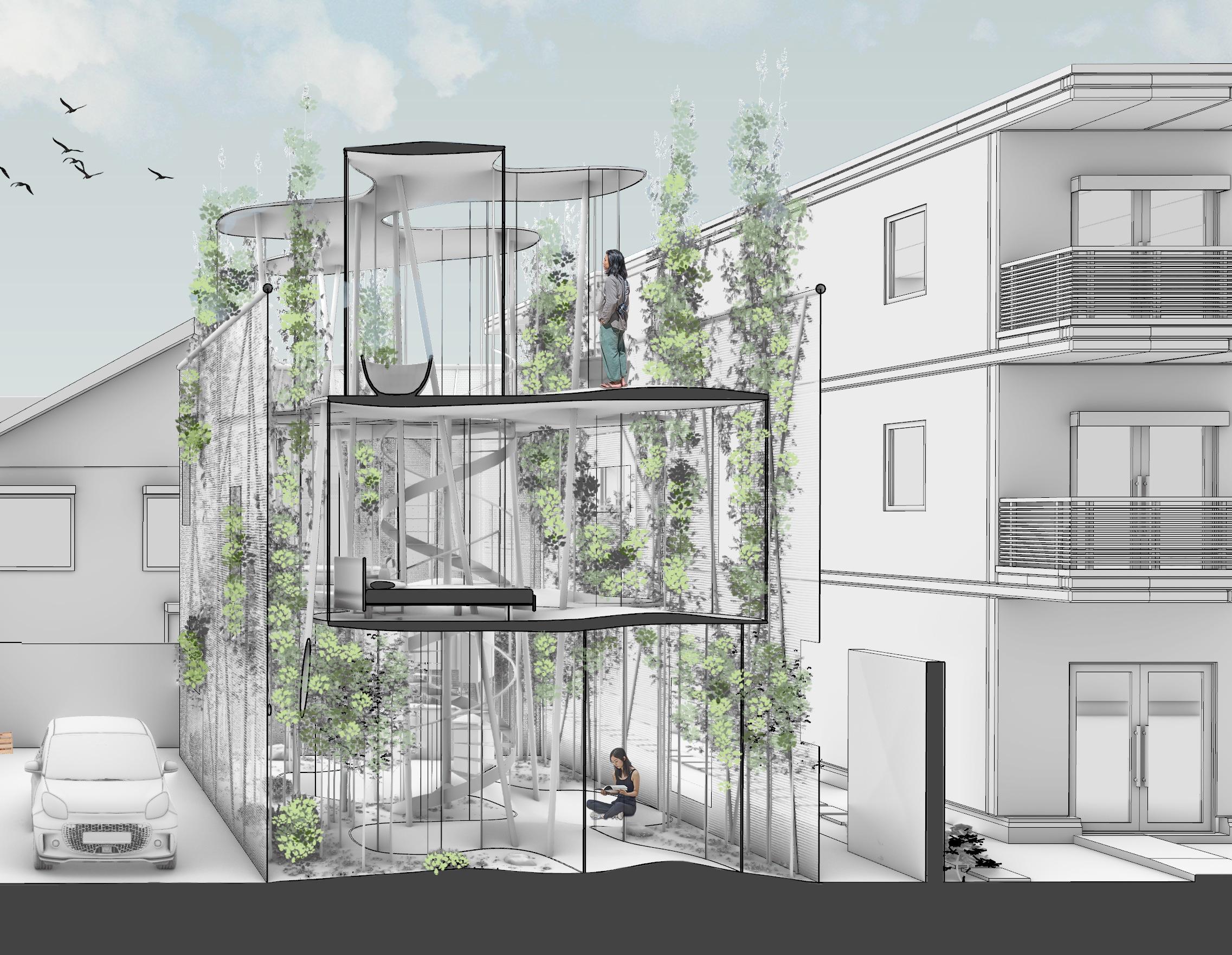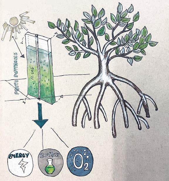 BIOSYNC LAB’S BIO-REACTIVE FACADE, INSPIRED BY ARUP'S BIQ HOUSE, USES ALGAE-FILLED PANELS TO TURN SUNLIGHT INTO OXYGEN AND BIOMASS, OFFERING A RENEWABLE ENERGY SOURCE WHILE IMPROVING AIR QUALITY.