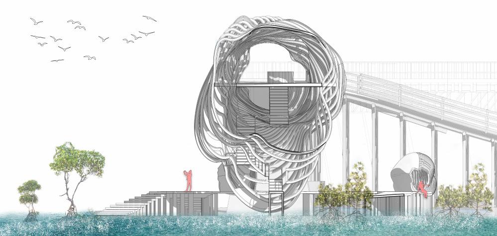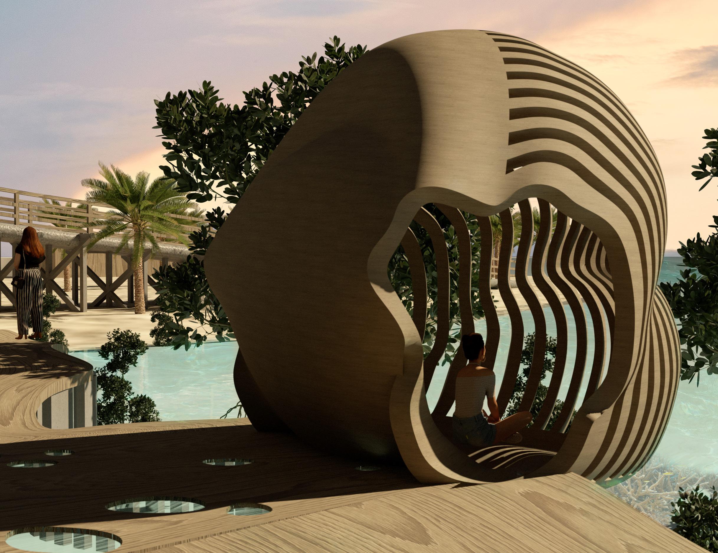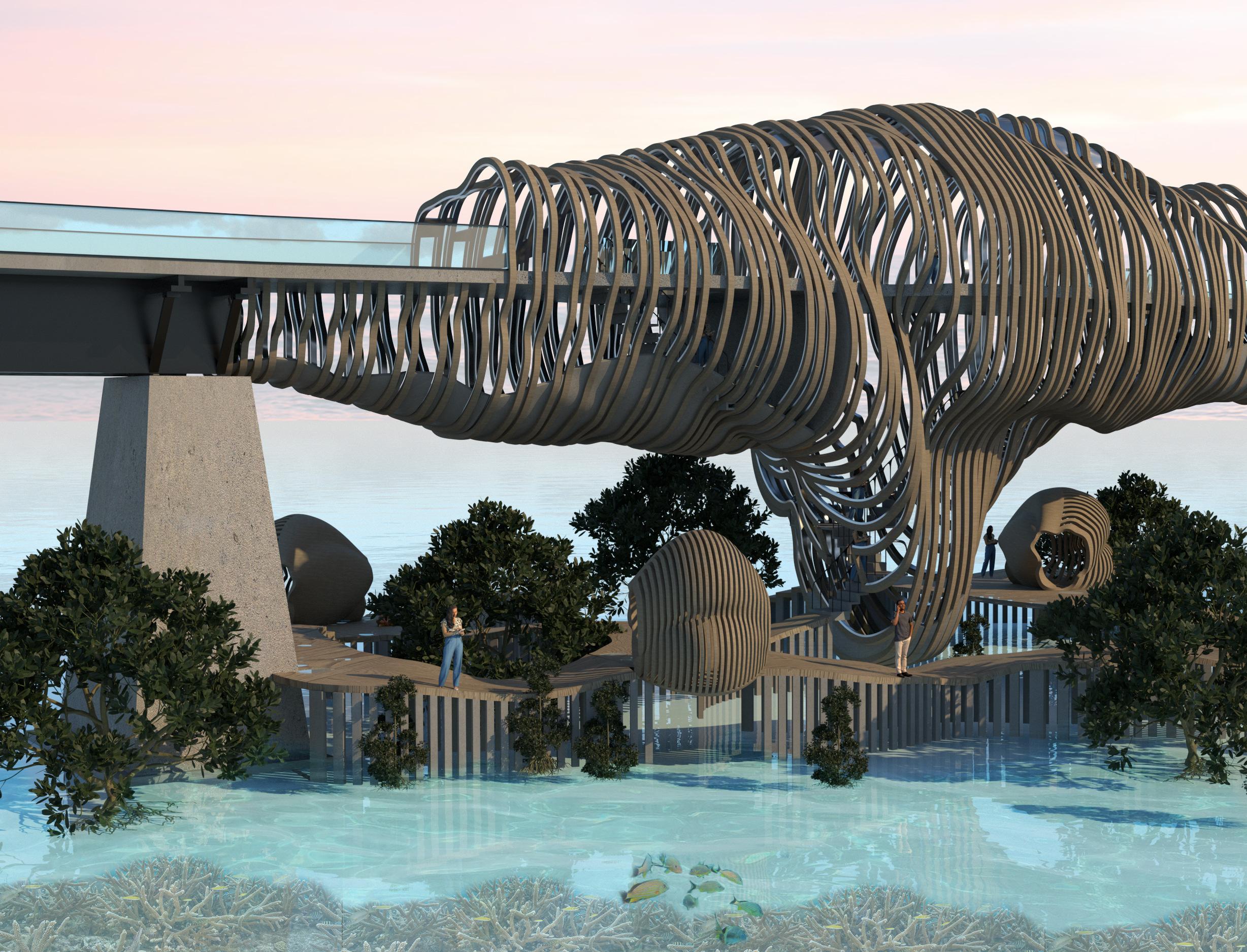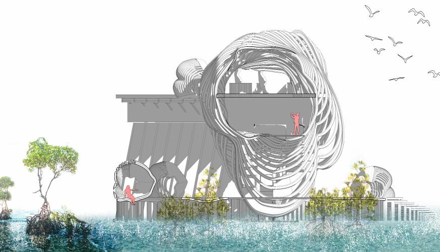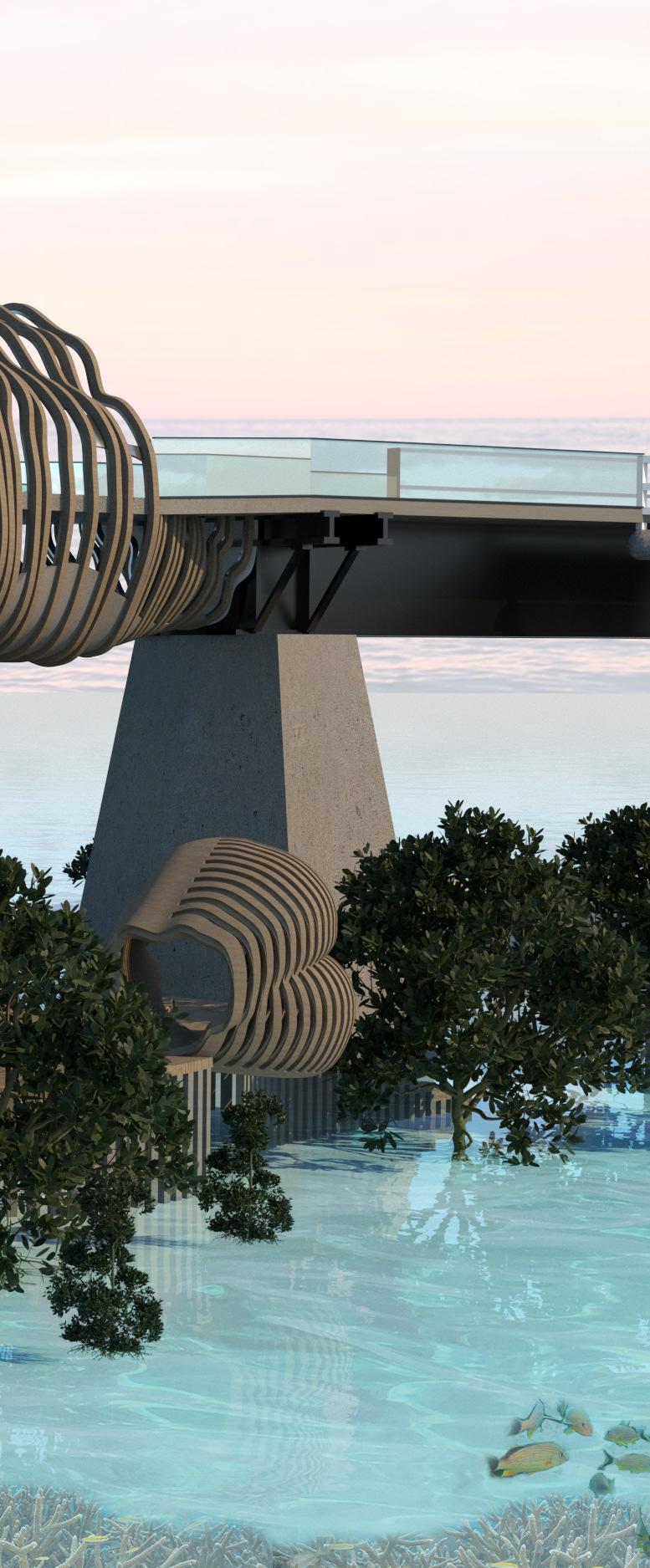 IT CREATES AN OPPORTUNITY TO CONNECT TO THE NATURAL WORLD BY BLENDING ENVIRONMENTAL AWARENESS WITH ARCHITECTURAL INNOVATION. USING BIO-CONCRETE, WOOD, AND STEEL FOR STRUCTURAL SUPPORT, THE FORM IS A TWISTING COVE THAT ROTATES ON ITSELF, TAKING INSPIRATION FROM CORALS AND THE REEF. THE COVE CREATES A SPACE FOR REFLECTION AND FOSTERS A DEEP CONNECTION WITH OCEAN LIFE AND SPECIES. THE INHABITANTS AND VISITORS CAN EXPLORE THE BIODIVERSE MANGROVE AND CORAL ECOSYSTEM THAT ARE HOME TO THOUSANDS OF SPECIES, INCLUDING FISH, AMPHIBIANS, BIRDS, AND INSECTS. THE DIRECT EXPOSURE OF THE VISITORS CONTRIBUTES TO THE IMPORTANCE OF OCEAN LIFE AND ITS WELL-BEING, RAISING THE NEED FOR AWARENESS IN OCEA++N CONSERVATION.