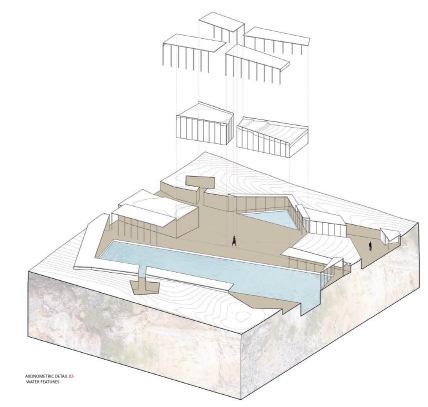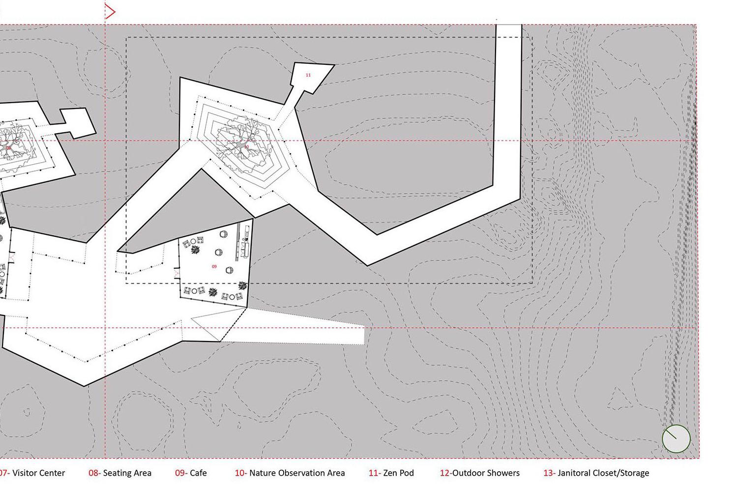 THE MAIN STORY UNFOLDS UNDERGROUND AS THE USER TRAVELS THROUGH THE EXCAVATED SPACE. THE EXCAVATED NATURE OF THE PROJECT CREATES A NATURAL COOLING EFFECT AND A SPACE OF ESCAPE FROM THE HEAT OF SUMMER FOR THE USERS. THE PARK FEATURES A FEW SPACES OF GATHERING THAT ARE EXCAVATED INTO THE GROUND AND BECOME AREAS OF OBSERVATION TO TAKE IN NATURE. THE SKY BECOMES THE CEILING OF THE SPACE. THE WHOLE PARK CREATES A PEACEFUL EXPERIENCE AND FEATURES ZEN SPACES THROUGHOUT. THE GOAL IS FOR THE USER TO BECOME ONE WITH THE LANDSCAPE AND APPRECIATE THE NATURAL SURROUNDINGS.