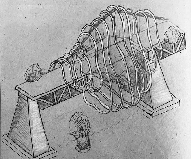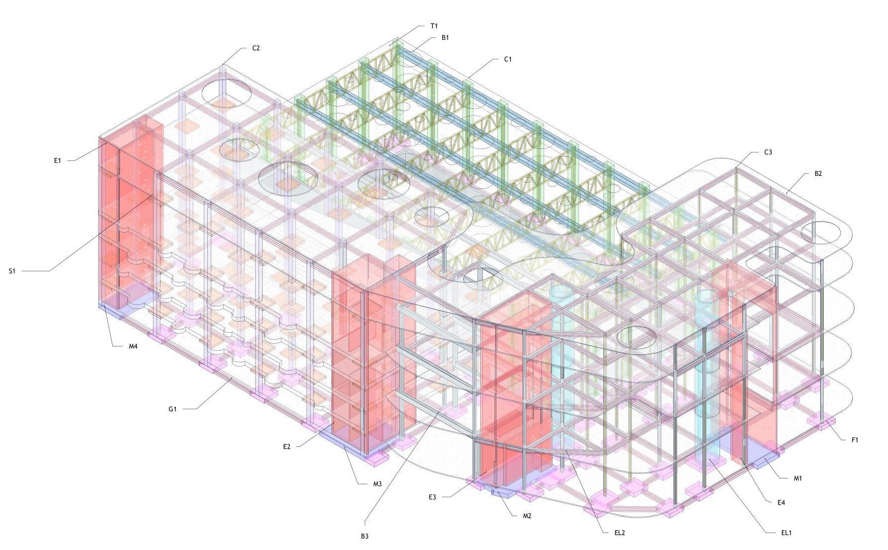 THE SLANTED COLUMNS ARE NOT ONLY STRUCTURAL ELEMENTS WORKING IN COMPRESSION AND TENSION BUT ALSO SCULPTURAL FORMS THAT EVOKE THE ORGANIC IRREGULARITY OF NATURE. THESE ANGLED SUPPORTS, ALONG WITH THE CURVED FLOORS AND CEILINGS, UNDULATE AND DIP, ECHOING THE SURROUNDING LANDSCAPE’S TOPOGRAPHY AND ALLOWING THE ARCHITECTURE TO BREATHE WITH A SENSE OF NATURAL RHYTHM.