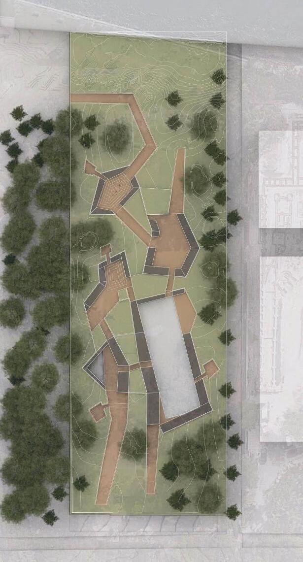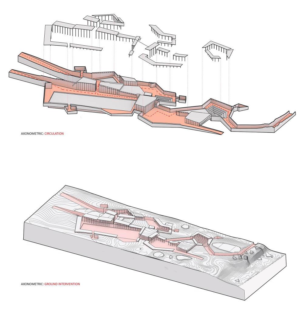 THE PROGRAM OCCUPIES THE UNEXCAVATED AREAS OF THE PARK, WHILE THE VOIDS SERVE AS PATHWAYS FOR CIRCULATION.