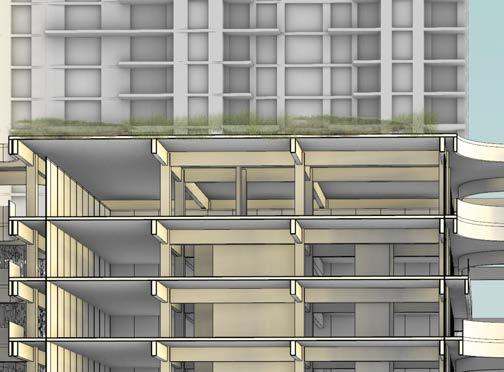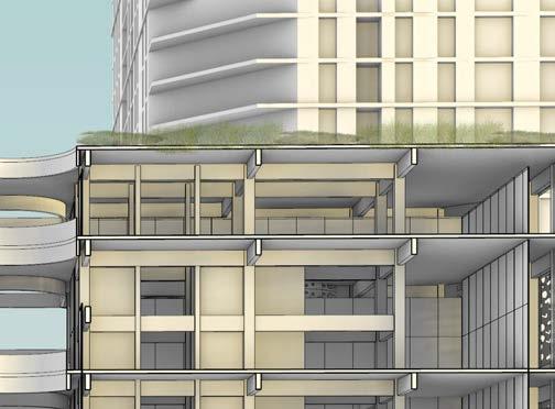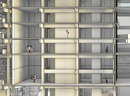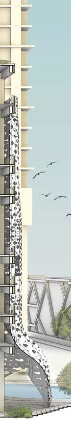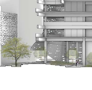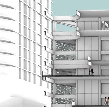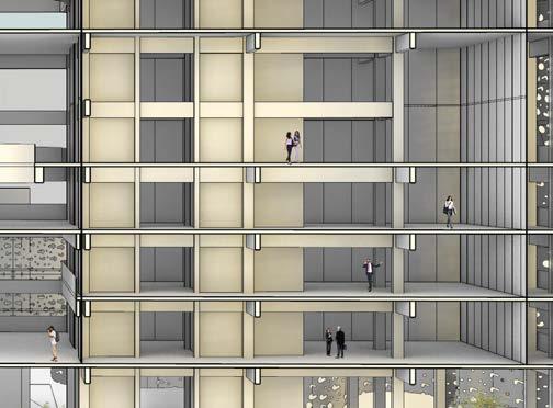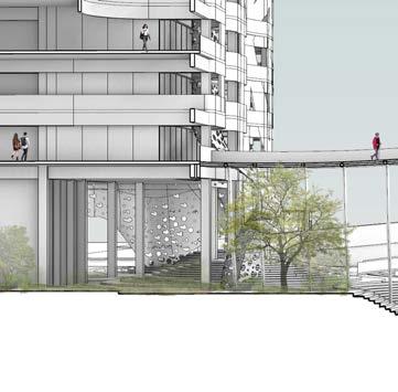 THE DESIGN ALSO ENGAGES DIRECTLY WITH THE URBAN LANDSCAPE THROUGH CAREFULLY PLANNED PUBLIC SPACES AND ACCESSIBLE GREEN TERRACES. BY INTEGRATING LANDSCAPED AREAS AT MULTIPLE LEVELS, THE BUILDING ENCOURAGES SOCIAL INTERACTION AND CREATES MOMENTS OF QUIET RESPITE WITHIN THE CITY. ITS DISTINCTIVE FORM NOT ONLY PROVIDES STRIKING VISUAL INTEREST BUT ALSO OPTIMIZES VIEWS, NATURAL LIGHT, AND AIRFLOW FOR ITS OCCUPANTS. THIS APPROACH REFLECTS A COMMITMENT TO SUSTAINABILITY, SHOWCASING HOW ARCHITECTURE CAN ACTIVELY ENHANCE URBAN LIFE WHILE RESPECTING THE ENVIRONMENT.