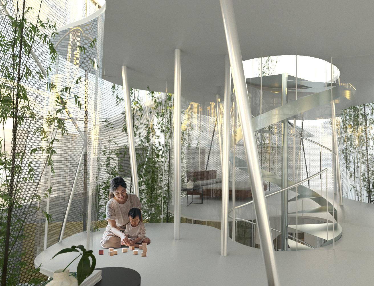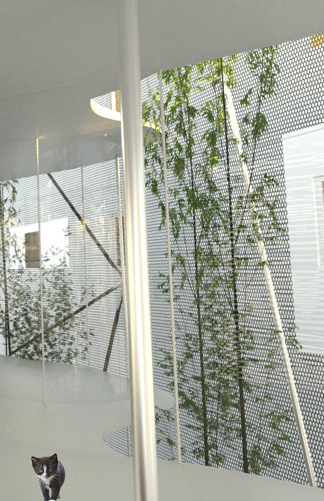 ENGAWA HOUSE OFFERS AN IMMERSIVE EXPERIENCE THAT TRANSPORTS ITS RESIDENTS FROM THE DENSE URBAN LANDSCAPE OF TOKYO INTO A SERENE FOREST SANCTUARY. ENVELOPED BY A DELICATE MESH THAT FILTERS LIGHT AND FRAMES VIEWS OF LUSH GREENERY, THE HOME FEELS SHELTERED YET OPEN, BLURRING THE BOUNDARIES BETWEEN ARCHITECTURE AND NATURE. THE TREES SURROUNDING THE STRUCTURE CREATE A SOFT, DAPPLED LIGHT THAT FILLS THE INTERIORS, ALLOWING RESIDENTS TO FEEL AS THOUGH THEY ARE LIVING WITHIN A FOREST RATHER THAN A BUSTLING CITY. THIS INTIMATE INTEGRATION WITH NATURE TRANSFORMS THE HOME INTO A TRANQUIL RETREAT, PROVIDING A SENSE OF ESCAPE AND CONNECTION TO THE NATURAL WORLD AMID TOKYO'S VIBRANT DENSITY.