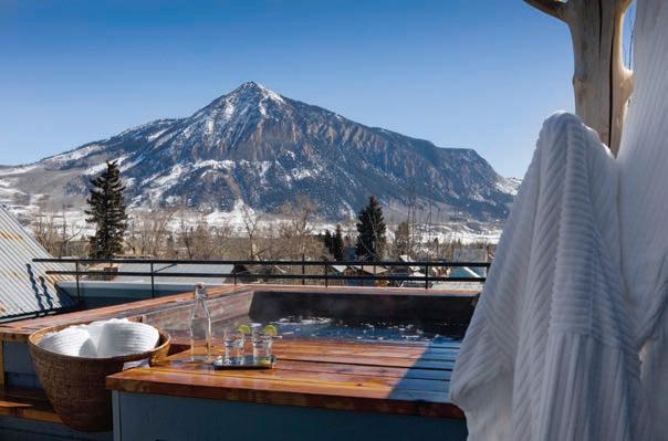 of aspen trees. Returning from a full day of outdoor beauty and adventure, and after enjoying a quick après in the rooftop hot tub, we toured the town of Crested Butte. Its charming, brightly colored Victorian-era buildings house independent shops ranging from apothecaries to art galleries. The thriving restaurant scene includes Public House, Eleven’s in-town restaurant. This modern-day saloon features a spectacular menu, including a goat cheese and pickled blueberry salad, and a pan-roasted whole trout paired with a red wine farro risotto. The top floor of Public House has three loft suites for lodging as well as a basement music venue that hosts public and private concerts alike.