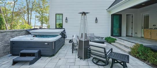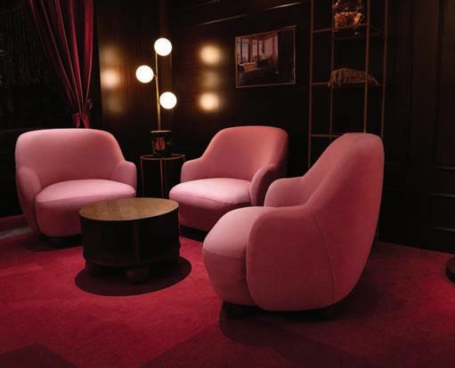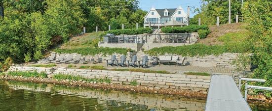 woods create an atmosphere that feels grounded in tradition but contemporary in spirit. Just below Kinnik, bright yellow loungers and striped umbrellas o ered sunbathers a spot to watch paddleboarders skim across the crystalline lake.
