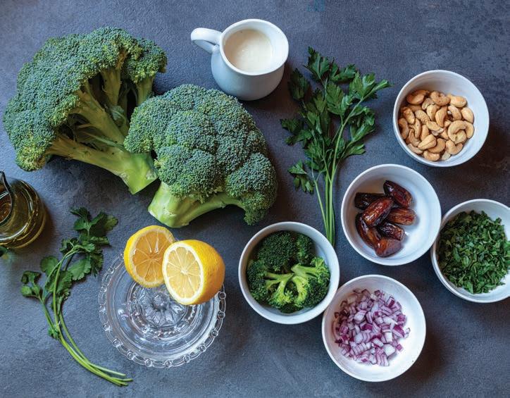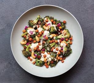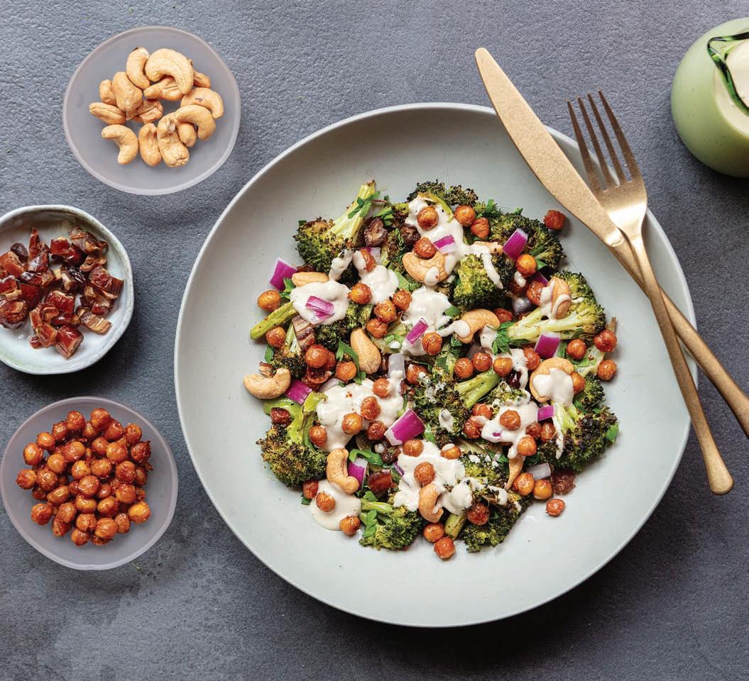In a large serving bowl, toss roasted broccoli with dates, nuts, cilantro, parsley, and red onion. Right before serving, add crispy chickpeas and toss with dressing, or plate individually and add a few dollops of dressing to each serving bowl.
