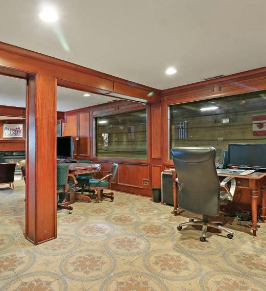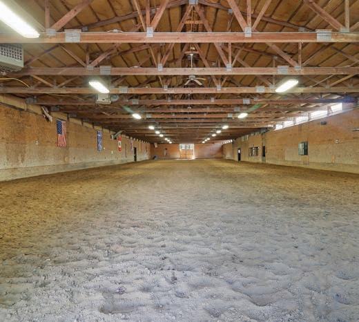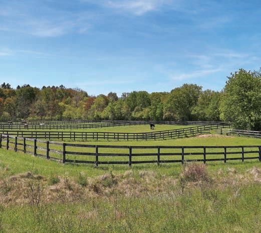 has a large fully-equipped pool house. On the property is a 22-stall heated stable, 200 feet by 60 feet heated indoor arena, outdoor arena, and 11 fenced turnout pastures. A mahogany viewing room with bathroom, o ce, kitchen with washer and dryer, wash rack, two tack rooms, and feed room complete the stable.