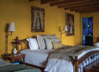 Each of the 15 rooms is distinct, brimming with vibrant local textiles and artisanal ceramic tiles. My suite, Indigo No. 8, featured a cozy loft for children above an expansive primary suite and two balconies with glorious views of the pond, cypress trees, gardens, and volcanoes. e light-drenched bathroom featured bird motif tile and an enormous tub beneath tall French doors, which ung open for the most scenic of soaks. Even the room key, adorned with a handmade tassel, was a small work of art.