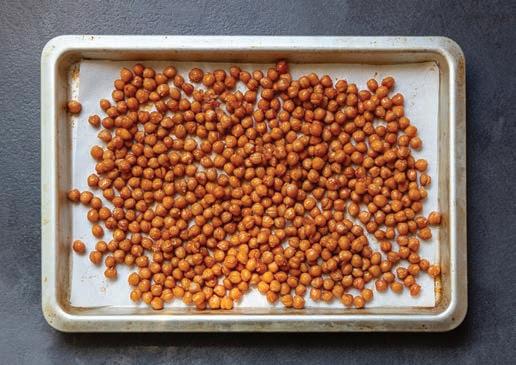 Drain, rinse, and dry chickpeas with paper towels. Spread the chickpeas on one of the prepared sheet pans and roast for 10 minutes. Remove chickpeas from oven. In a large bowl, combine oil, salt, paprika, and maple syrup. Stir in the chickpeas to coat well. Pour glazed chickpeas back onto the parchment-lined pan and place in oven for another 20 minutes until very well crisped.