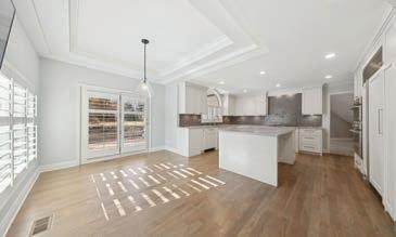 e primary bedroom is both traditional and sophisticated, incorporating the homeowners’ love of blue in the decorative touches throughout. e velvet loveseat was repurposed from another area of the home, enhancing this suite perfectly.