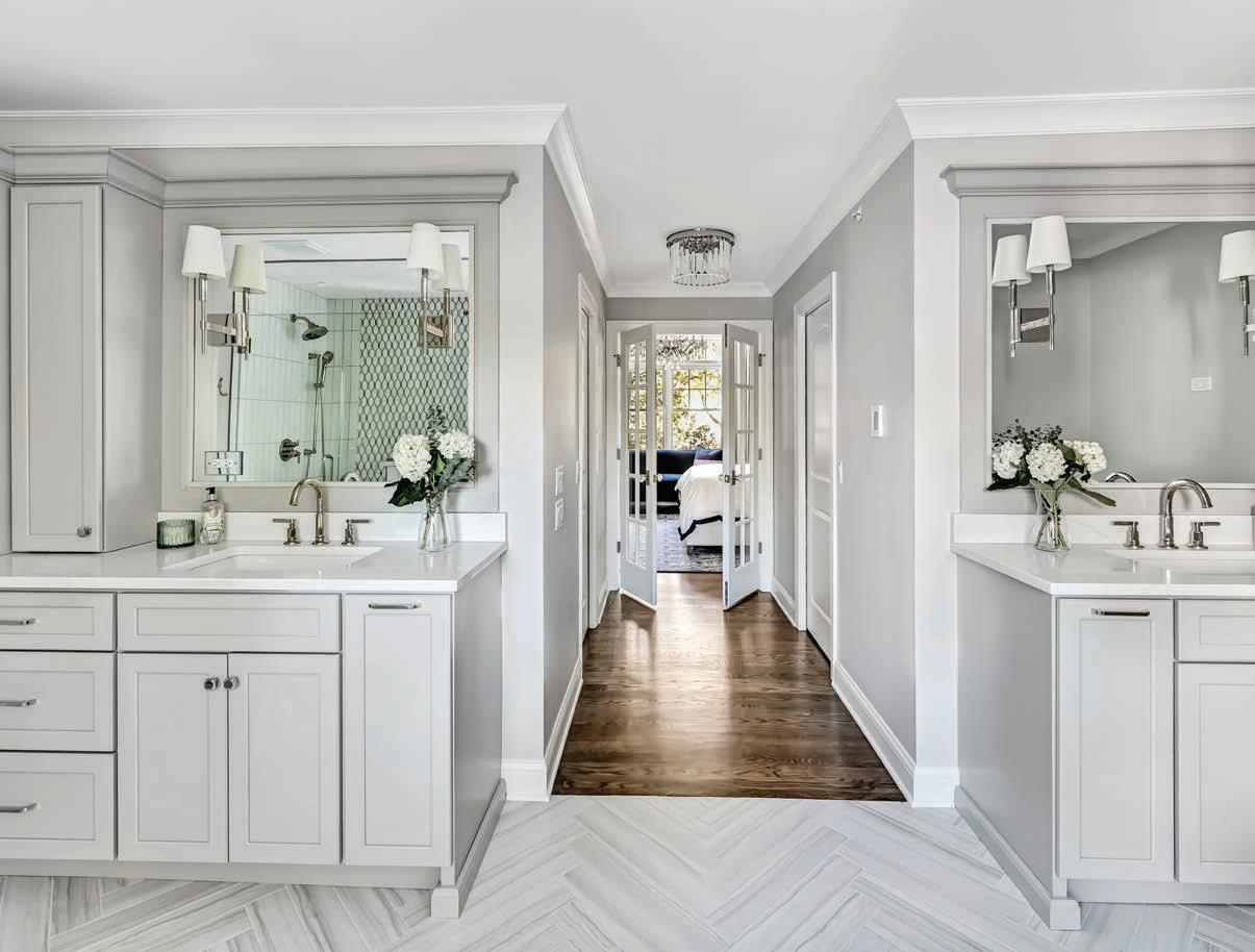 His and hers vanities with in a soft neutral grey tone complement the tile perfectly.