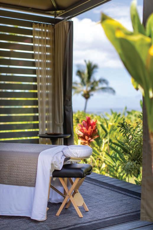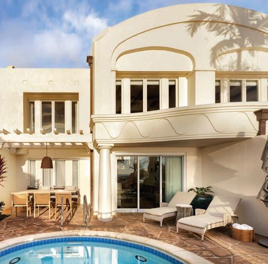 Each two-story villa offers 1,800 (or more) square feet, a fullyequipped kitchen, dining area, and cozy living room to watch movies after a day spent in the sun outside. Luxuriate in the deep soaking tubs, unpack at leisure in one of the many walk-in closets, and take advantage of the private laundry facilities and pack light—a true luxury. Order e Villa BBQ Experience for a private barbeque on the villa’s airy patio while watching the sun set over Polo Beach. Or enjoy a casual meal of to-go salads, poke bowls, and pizza from the on-site Makana Market + Café, as the kids splash in the private plunge pool.