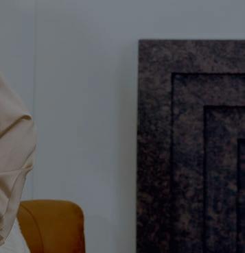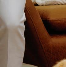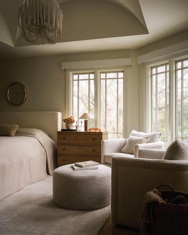 of the home’s new sensibility. Wagenbach rethought the entire space, reconfiguring the bathroom and adding glamour with a Michaelangelo stone, putting a new closet behind it and making the bedroom more compact. “it sounds counterintuitive to make a bedroom smaller,” she admits. “But it actually made it more functional.” She designed the space around an upholstered Moss Home bed, a simple, streamlined piece that allowed the subdued palette to unfold in soft gradations. A serene sitting area, furnished with Hooker Furniture swivel chairs and a matching ottoman, makes for a cozy reading nook.