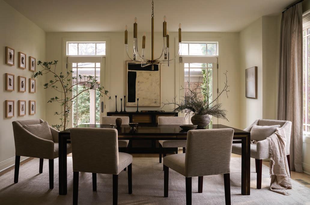 be comfortable, they have to be upholstered.” is guided her choice of Rowe dining chairs in a performance fabric. that now soften the room for everyday use. She also layered in artwork that brings warmth without overwhelming the space: a painting by Chelsea Feld anchors one wall, while nine smaller works—created in collaboration between Wagenbach and local artist Maureen Claffey—adds subtle texture and color on the adjacent wall.