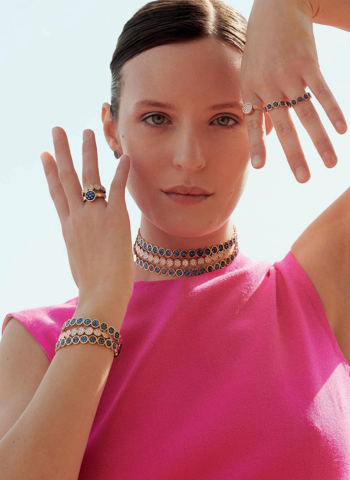 Callie wearing Alexander McQueen dress, Neiman Marcus. Valentino shoes, Neiman Marcus. Photography by Runvijay Paul / Styling by Theresa DeMaria / Hair and Makeup by Kayla Jarzab / Modeling by Bria Condon and Callie Johnson, Select Model Management Callie wearing blue Alexander McQueen dress, Neiman Marcus. Jimmy Choo shoes, ikram. Mikimoto and John Hardy jewelry, CD Peacock.