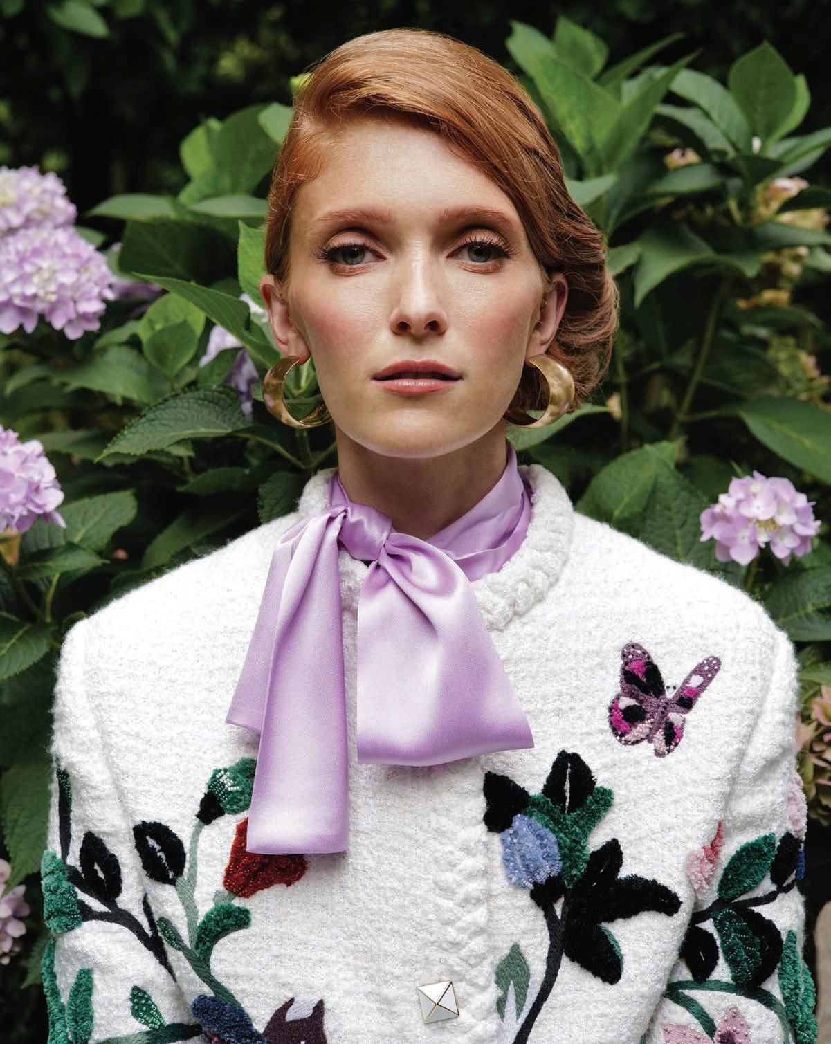Bria wearing Gucci dress, jacket and silk bow, ikram
