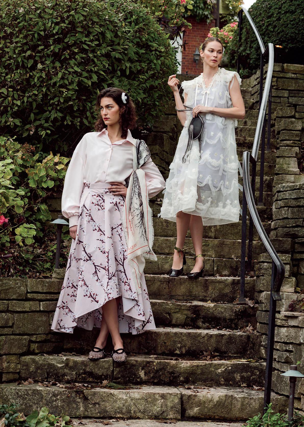 Gina wearing Alexander McQueen long sleeve blouse and skirt, Alaia embellished ballet shoe, Neiman Marcus, Michigan Avenue. Breck wearing Simone Rocha tulle dress, FOLOV embellished bag, ikram