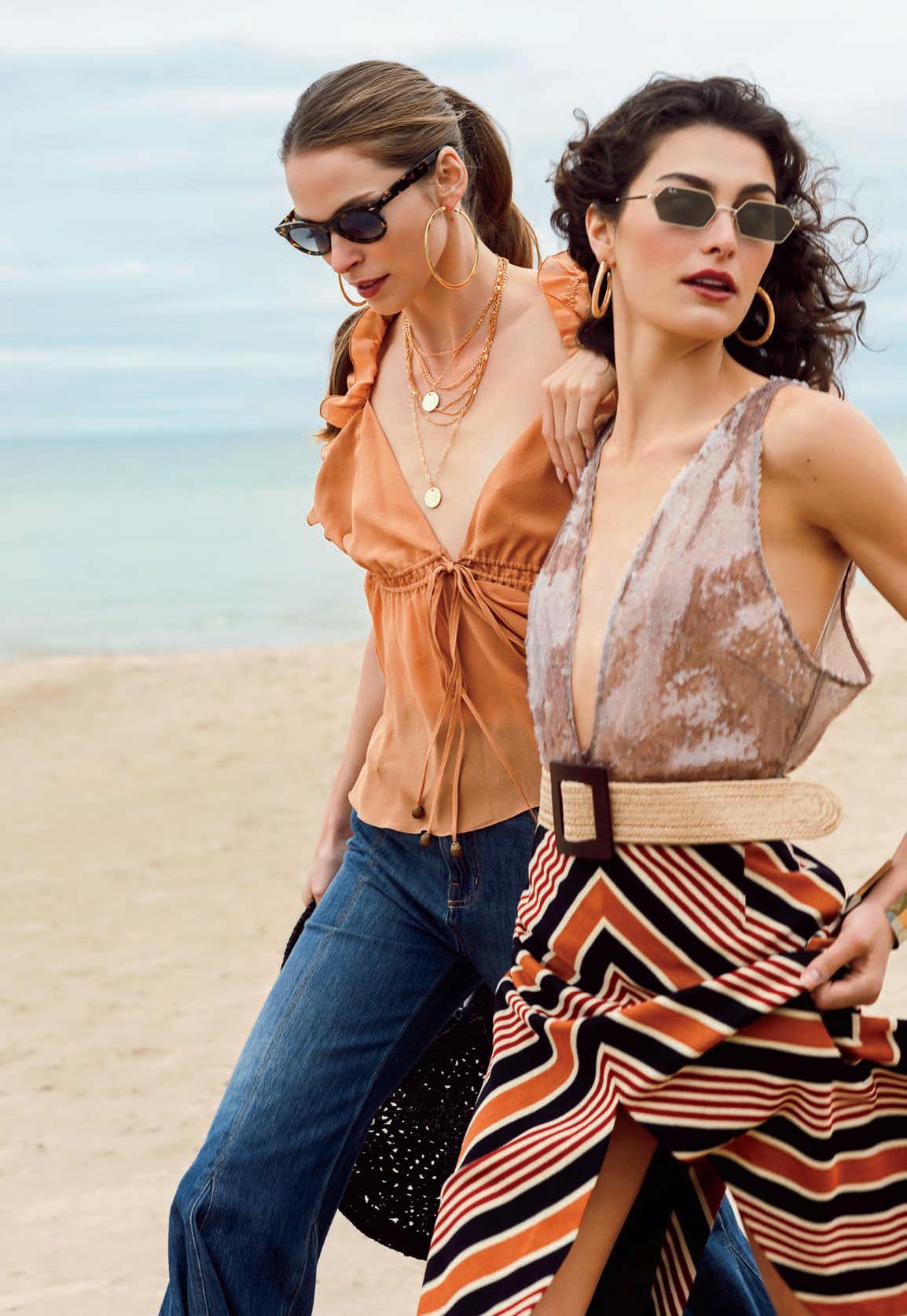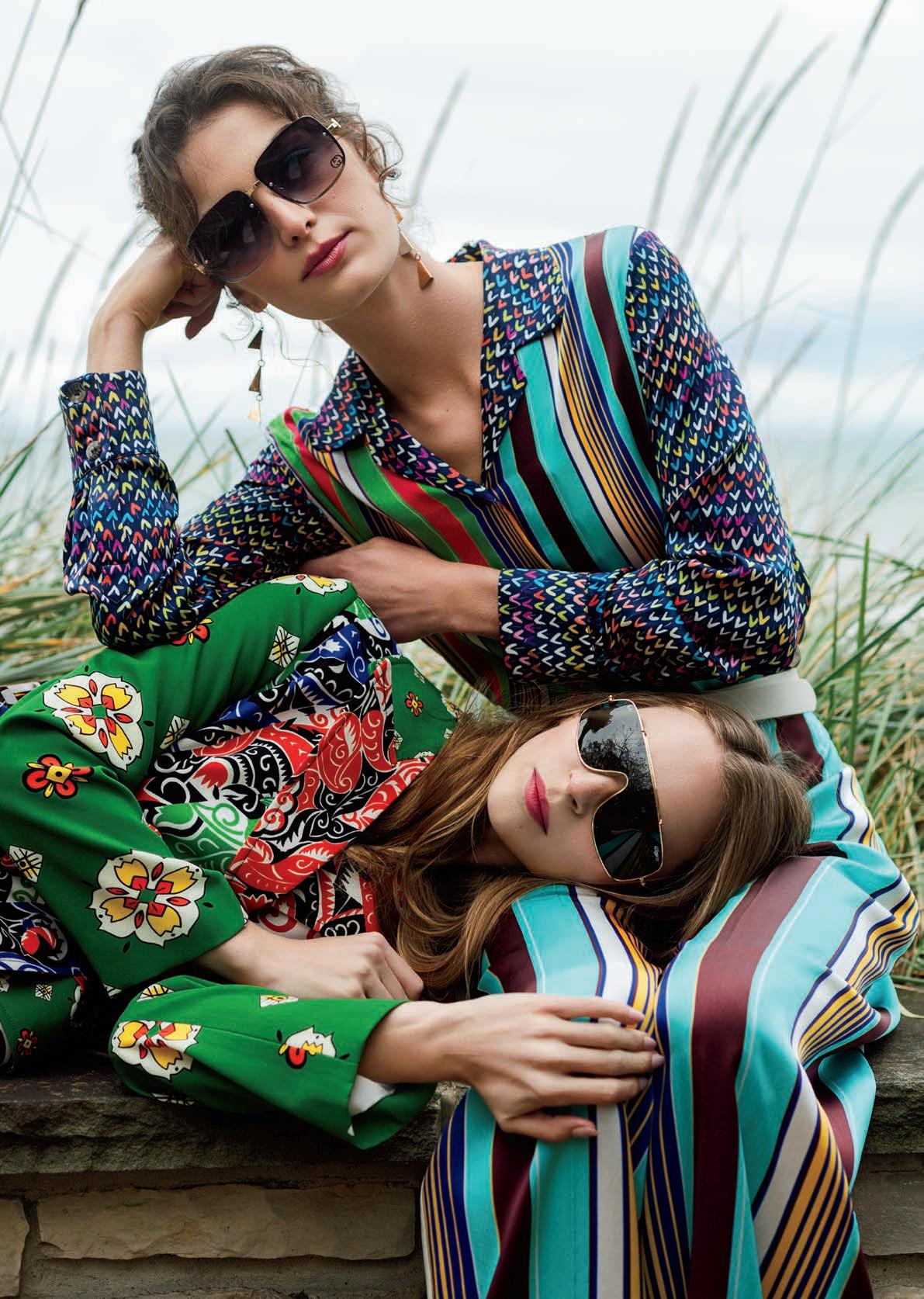 Breck Gambill and Gina Magro of Select Model Management showcasing spring fashions featured in Surf, Sand, and Style: Spring Fashion Unveiled. Breck is wearing silk blouse with belled Chloé Jean, JACQUEMUS bag, Ray-Ban sunglasses, Neiman Marcus Michigan Avenue. Gina is wearing Lapointe low v-neck blouse, Missoni slitted skirt, Ray-Ban sunglasses, Neiman Marcus Michigan Avenue. Photography by Adam Mayer/Styling by Theresa DeMaria/Hair & Makeup by Leanna Ernest