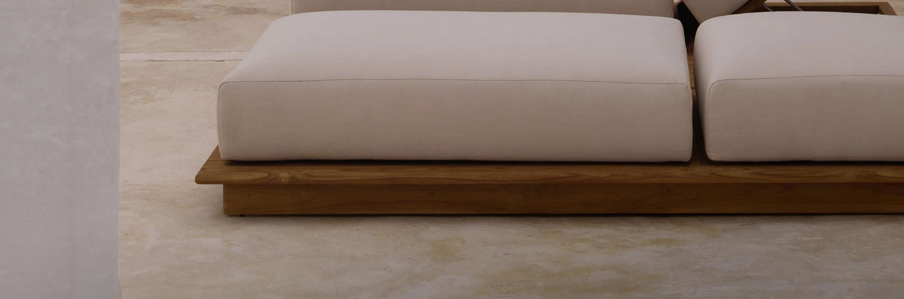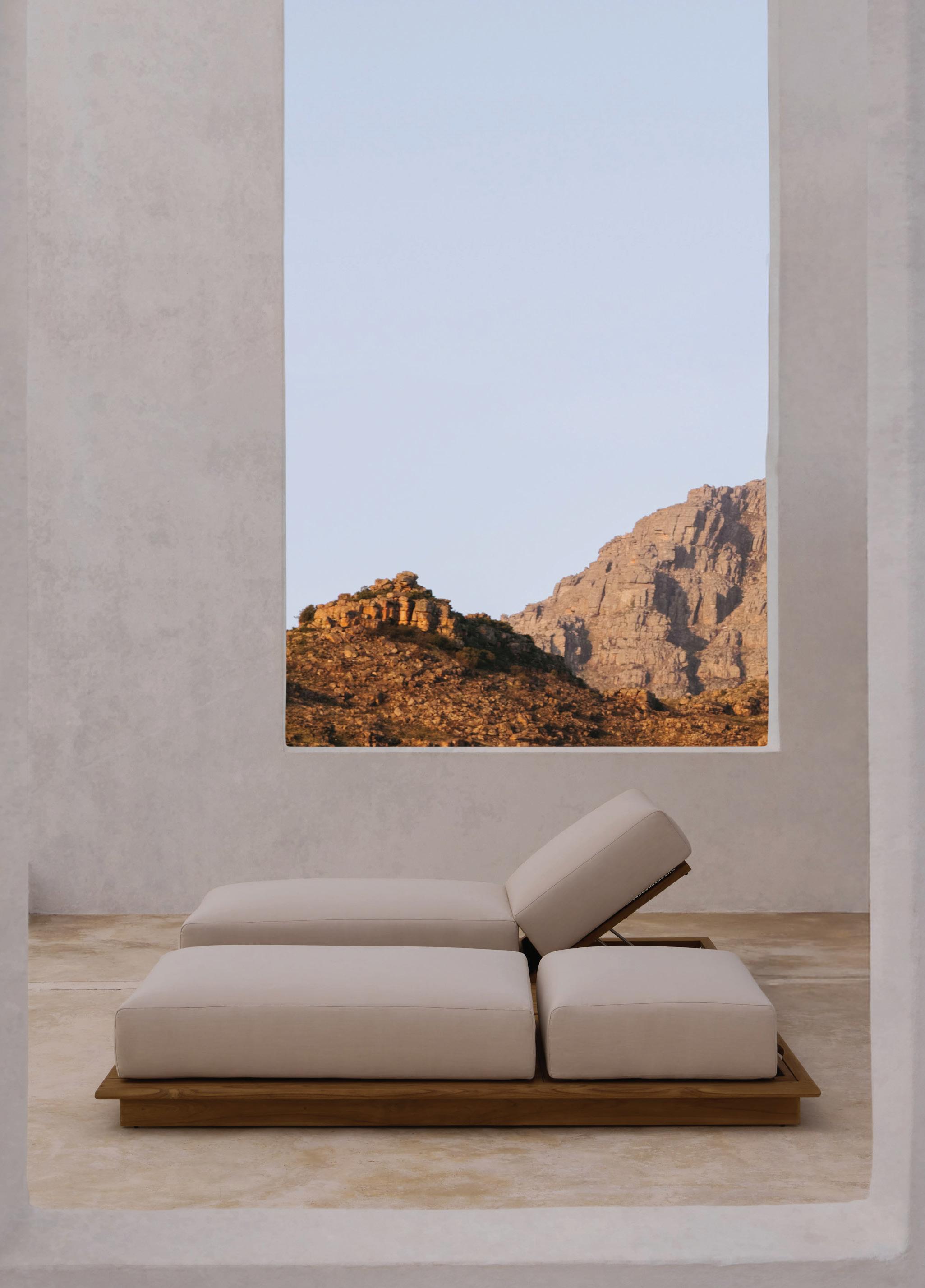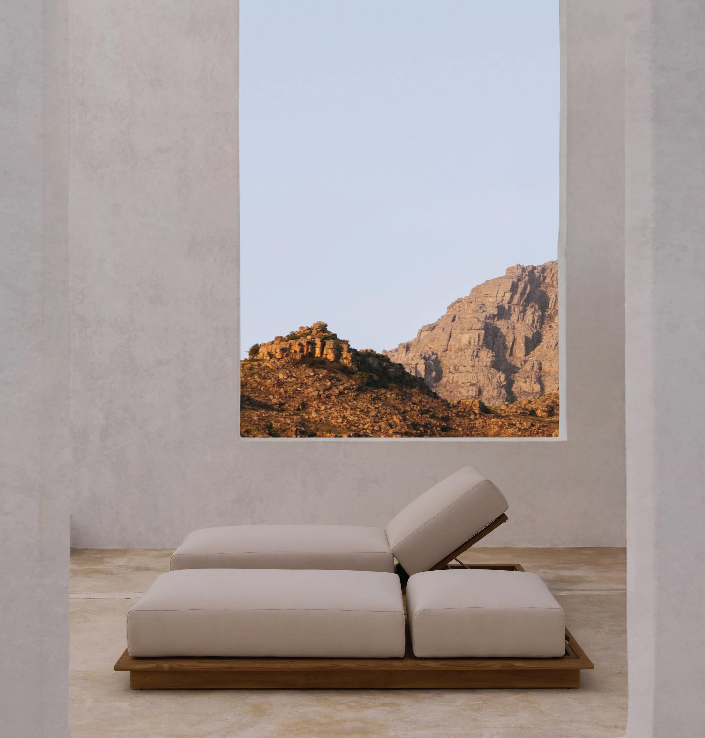 Upholstered in weather-resistant fabrics with a soft, tactile feel, each element invites rest and conversation, offering comfort that endures through the seasons. Complementing these are our loungers, sculpted in shape and scale, designed for languid afternoons and sun-drenched pauses. Their generous proportions and gentle curves echo the undulating lines of the horizon itself – relaxed, grounded, and timeless.