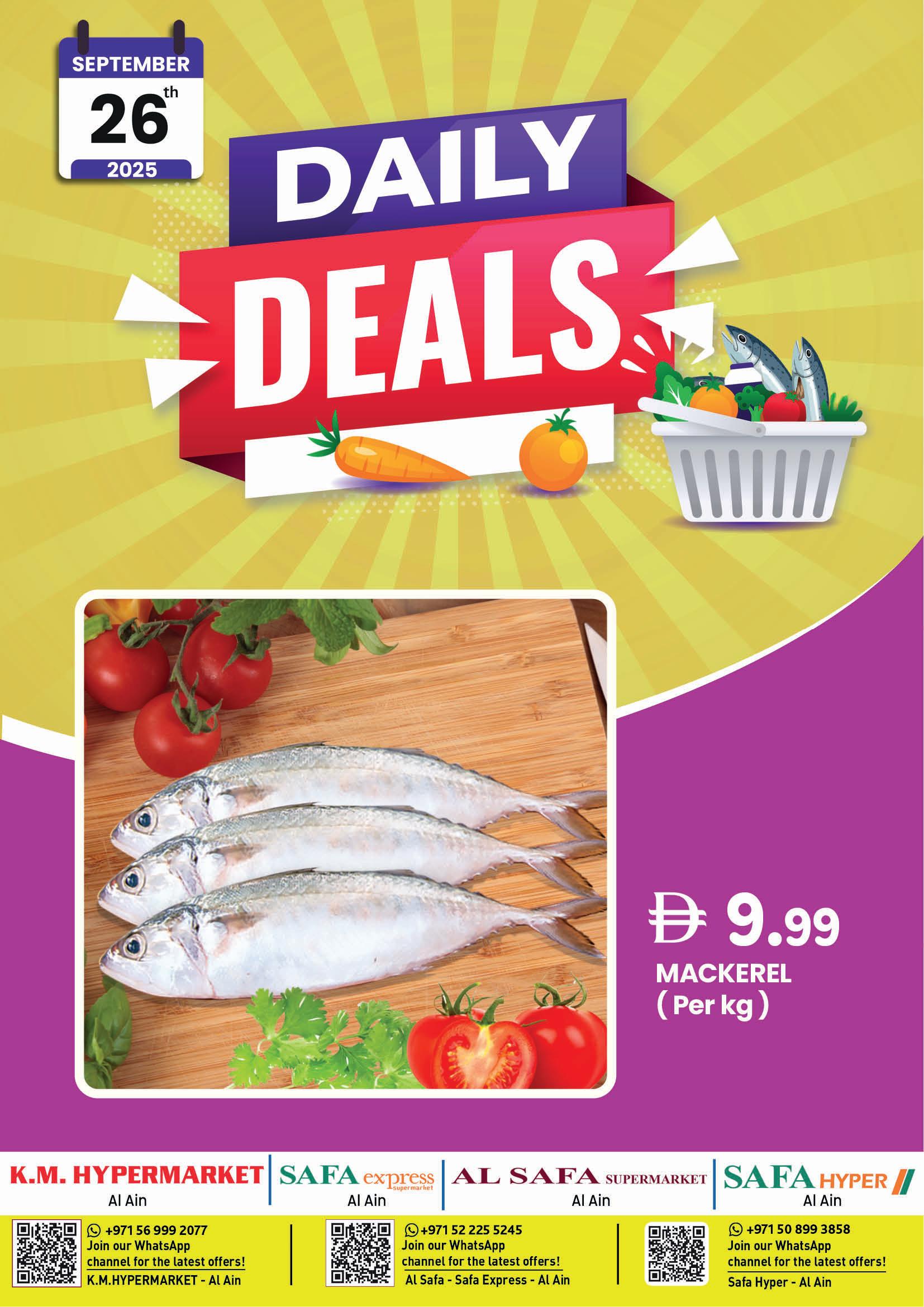 Enjoy the best fish offers today at K.M. Hypermarket, Safa Express, Al Safa, and Safa Hyper in Al Ain. Don’t miss out on these exclusive daily seafood deals, available only on 26th September 2025. Shop fresh and save big at your nearest store in Al Ain!